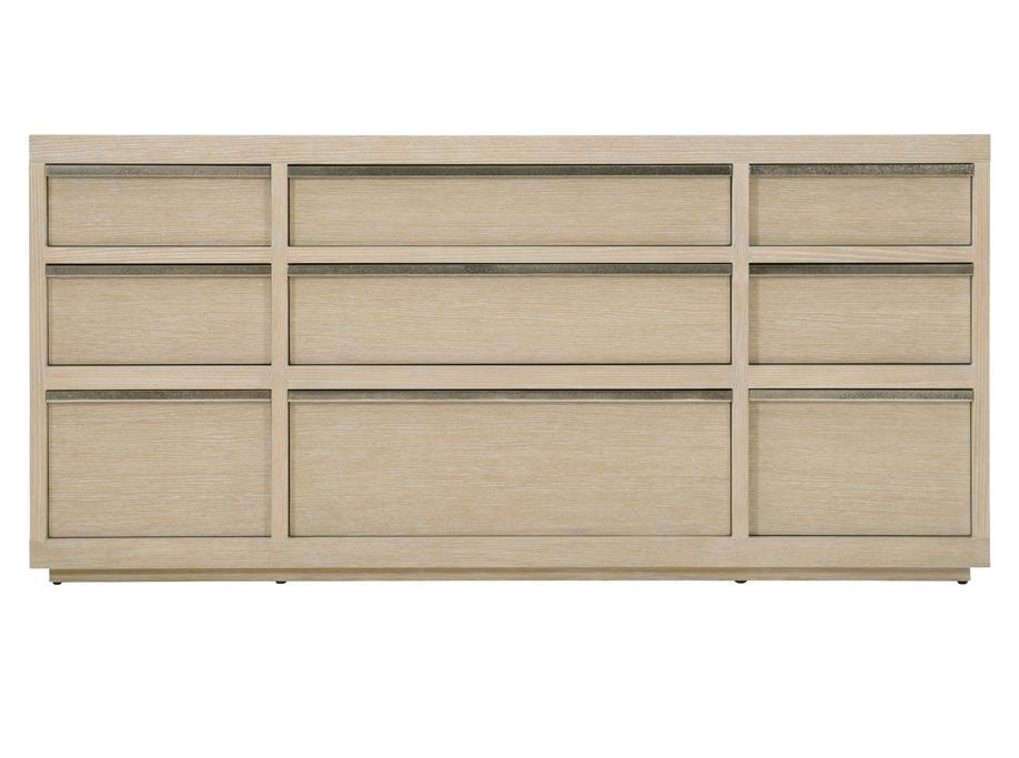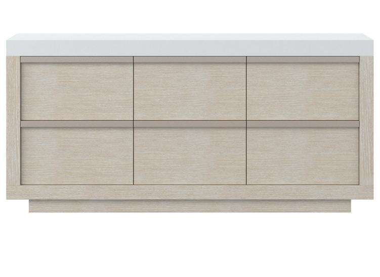 Faux stone top in Fossil finish. Nine drawers. Adjustable glides. Anti-tip kit. Dune finish. Appearing on pages Back Cover, 20.