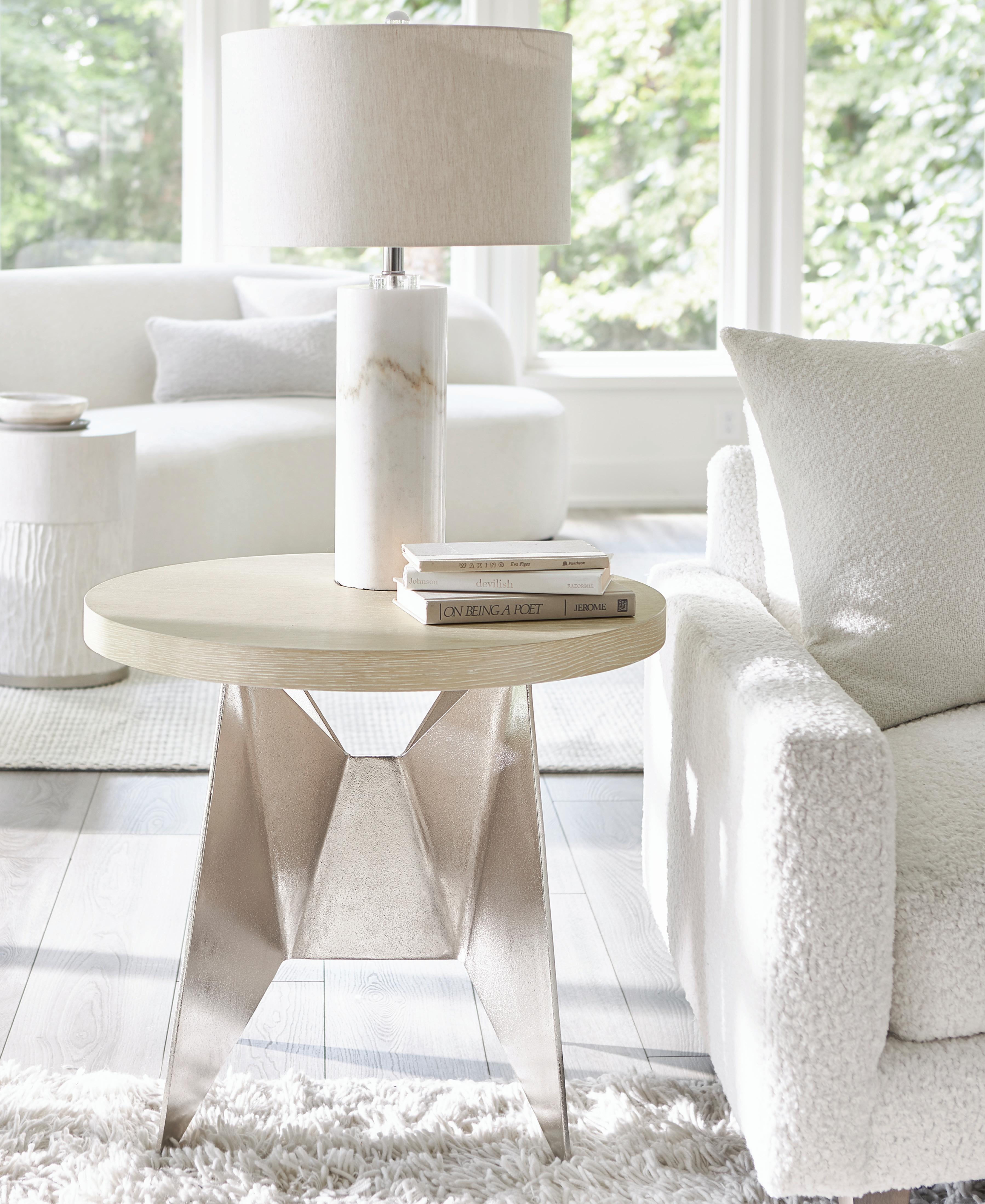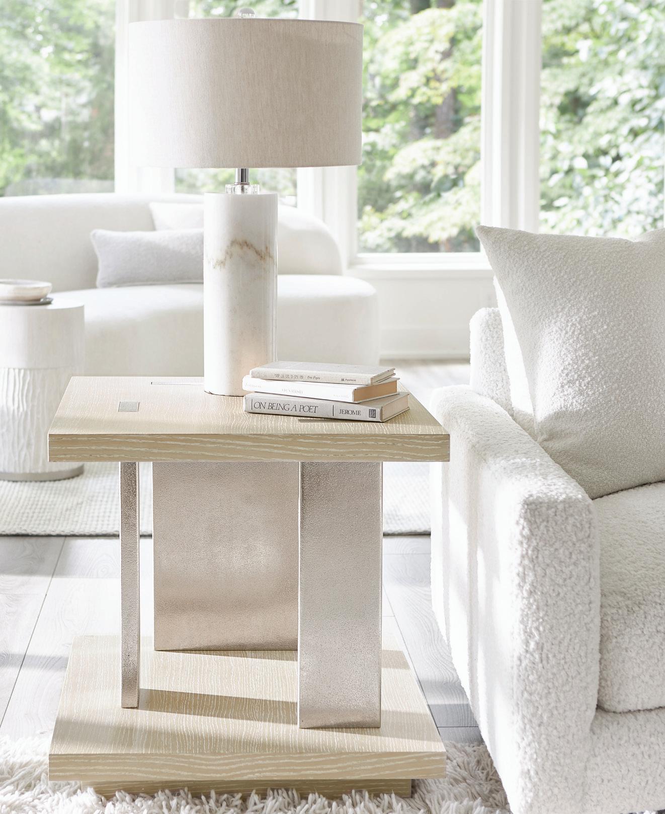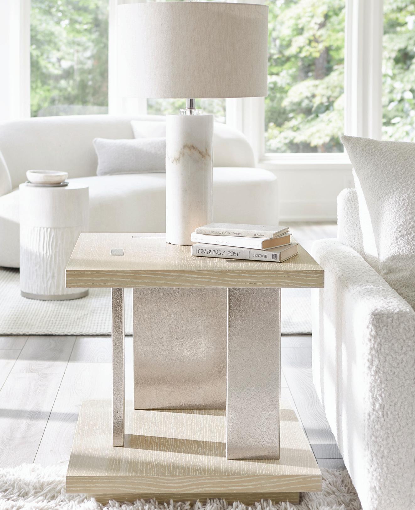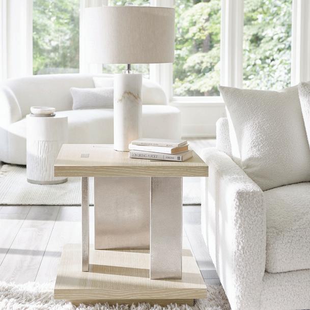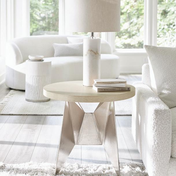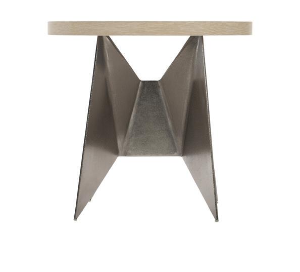Cast aluminum geometric base in Shiny Nickel finish. Top in Dune finish. Adjustable glides. Appearing on pages 1, 15.