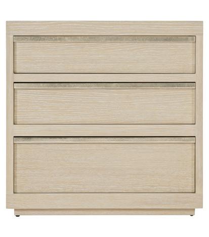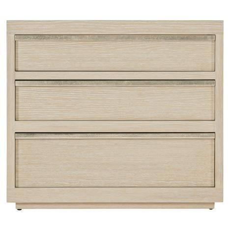 Three soft/self-close doors with cast chiseled fronts. Case in Weathered Bone finish. Plinth base. Appearing on page 6.