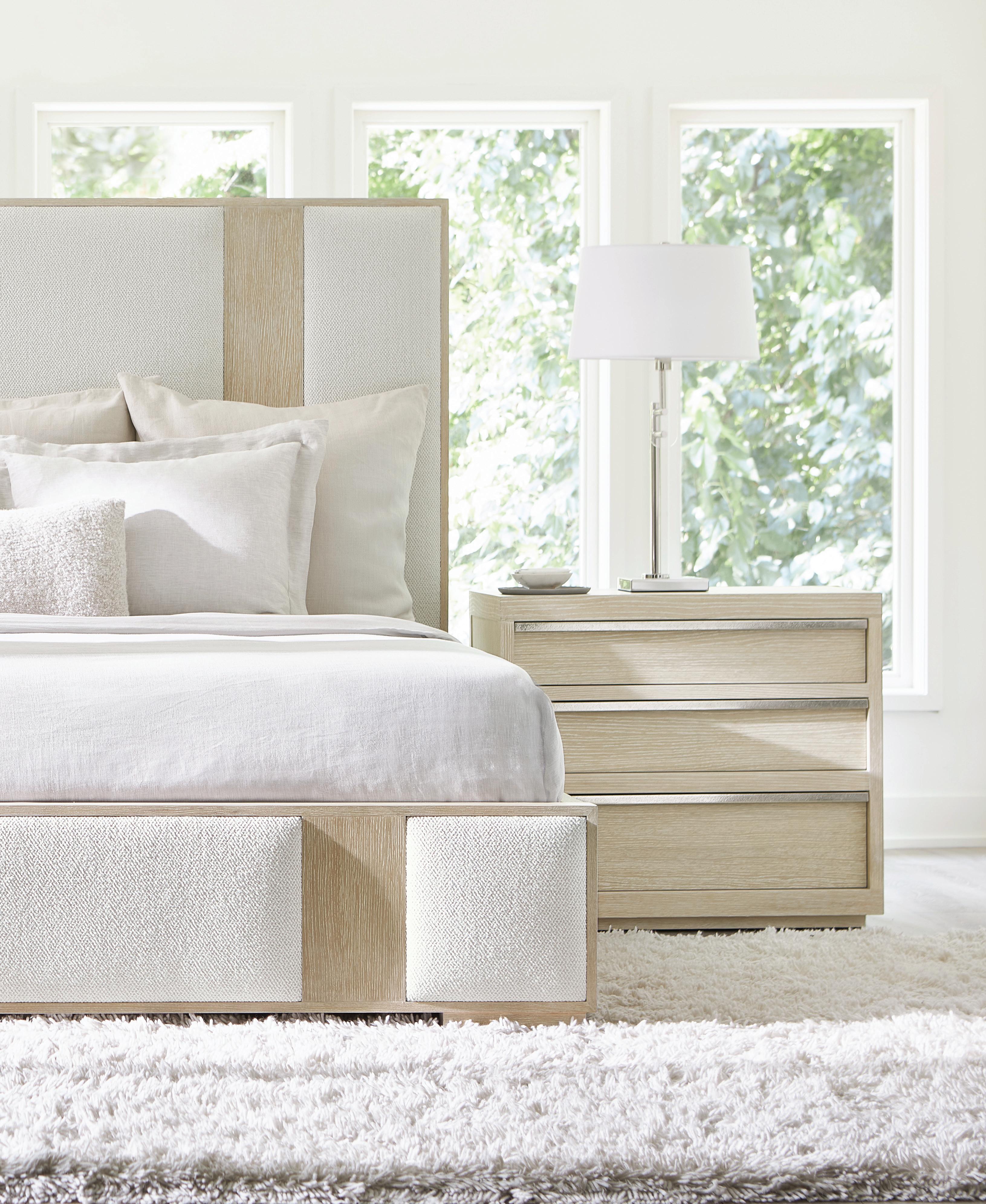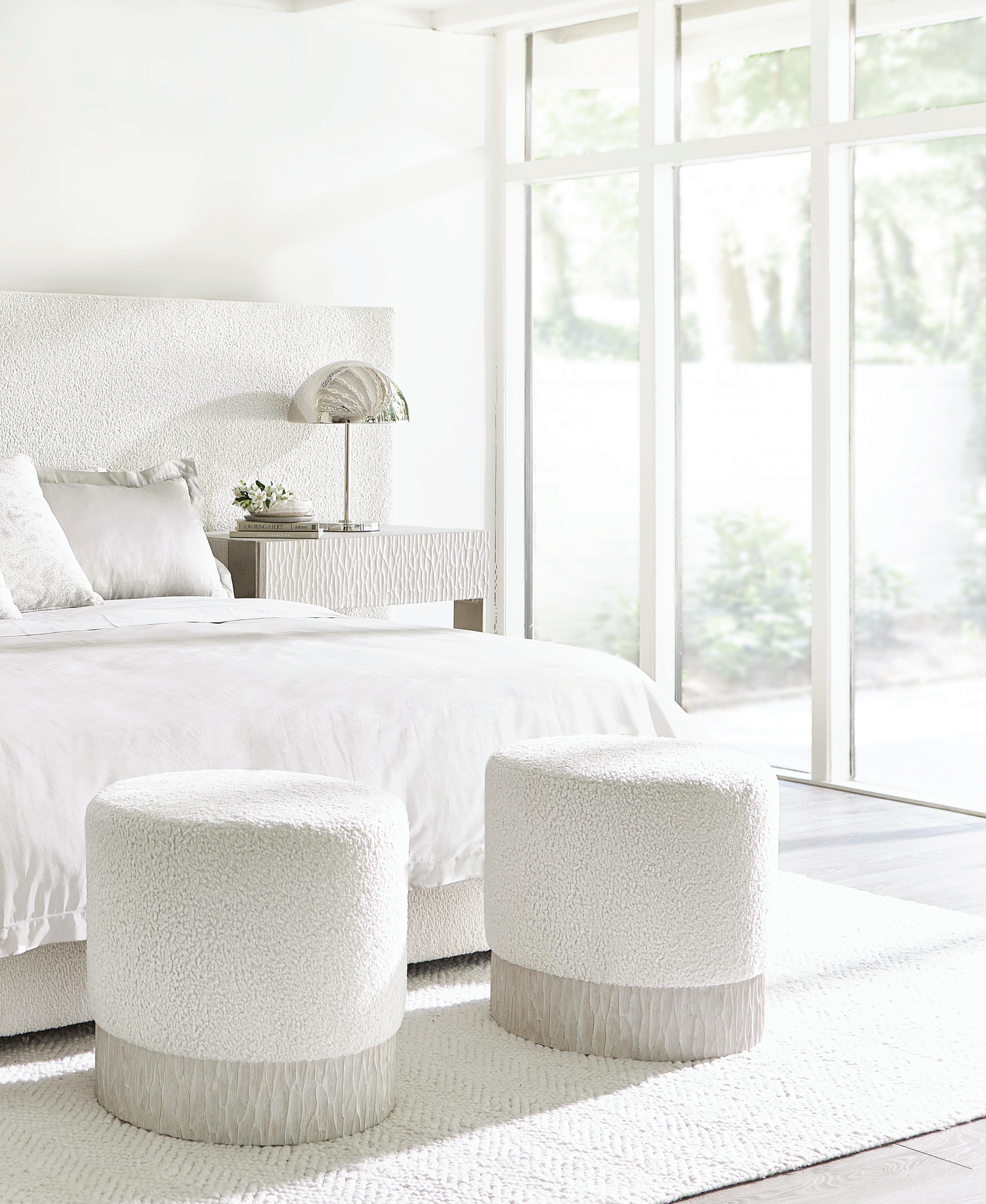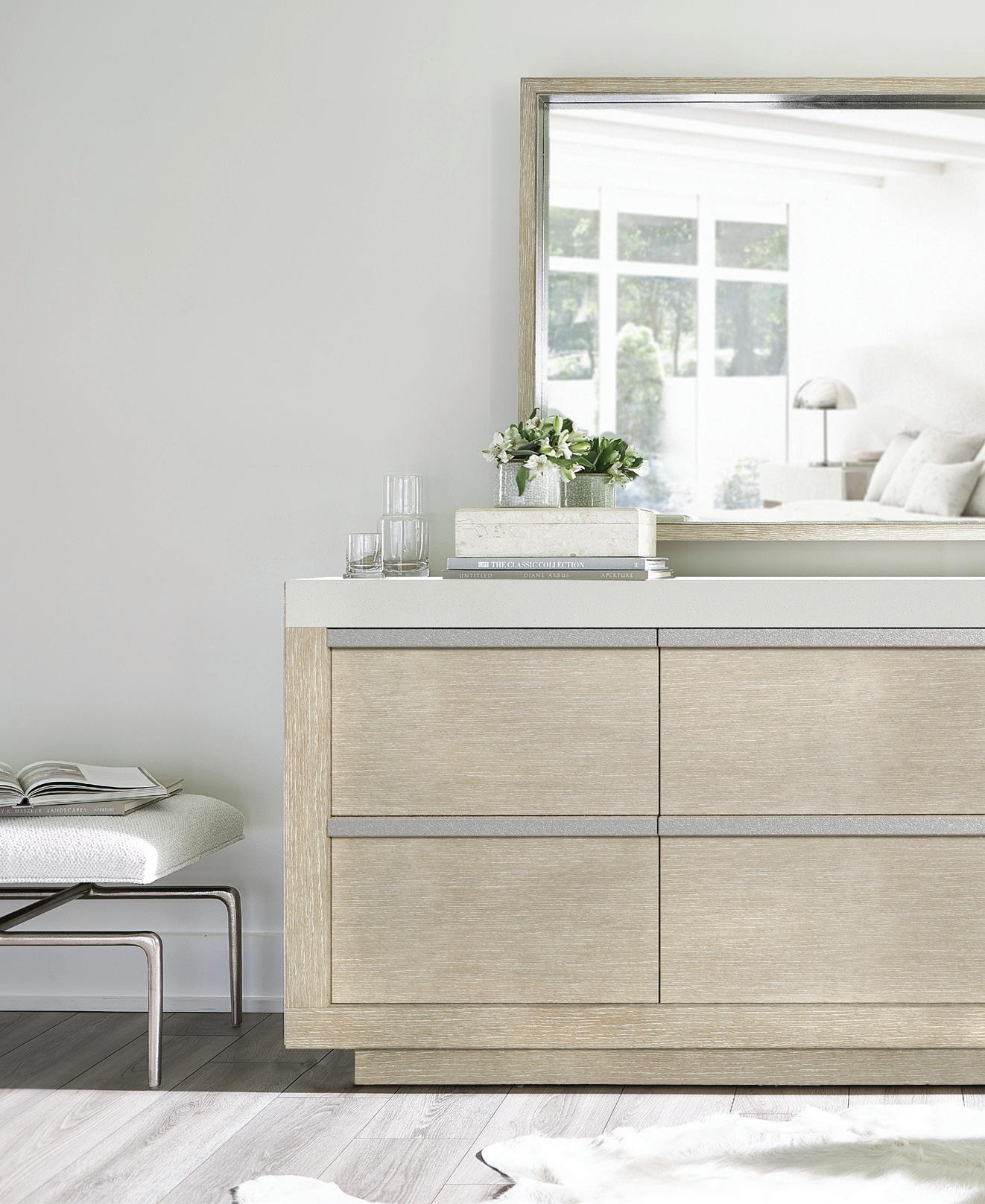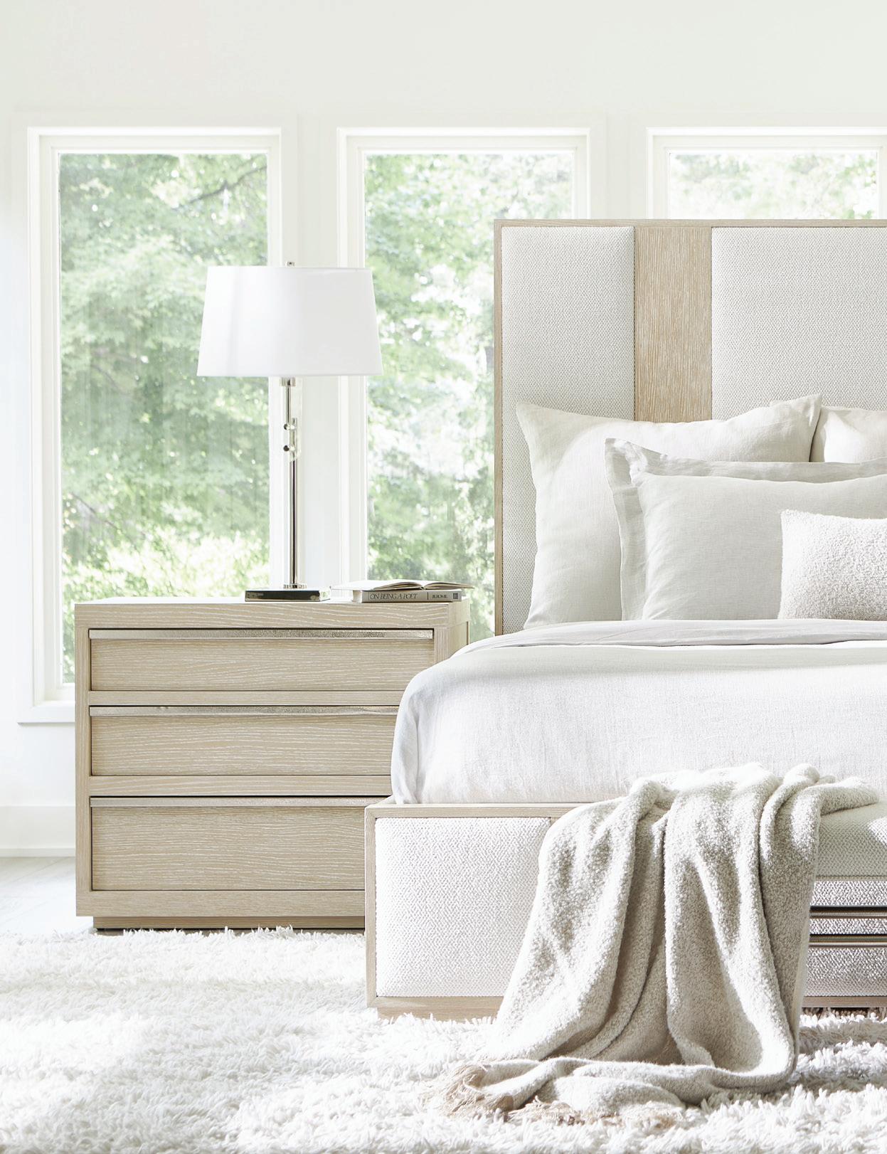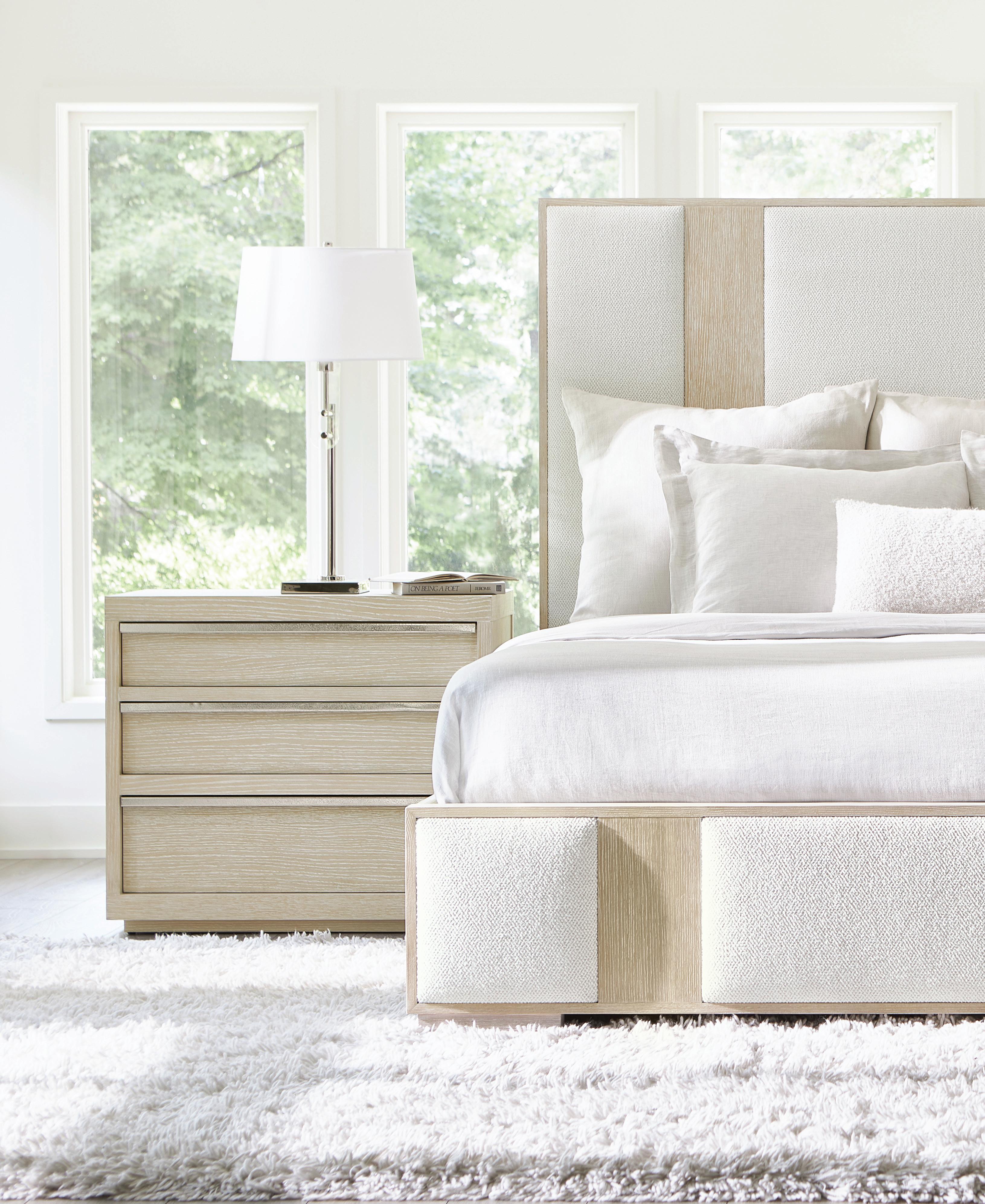 Defined by the beauty of simplicity, Solaria combines the clean lines of minimalism with layers of texture in a tonal palette of washed natural hues. Unadorned profiles are built with flawless craftsmanship, combining wire-brushed oak, stone and chiseled surfaces with rustic cast aluminum. The look is refreshing and uncluttered, building on modernist style with an elevated aesthetic and tactile wood grain. Geometrics and smooth surfaces offer hints of Bauhaus influence, while shearling adds warmth and softness. Innovative use of space and form lend subtle definition and drama to weightless open frames, floating shapes and an expanded headboard. Materials find the light in pale shades of limestone, sand, bone and wheat with understated contrast. The collection is sophisticated, but relaxed and unpretentious with an elemental, reflective purity