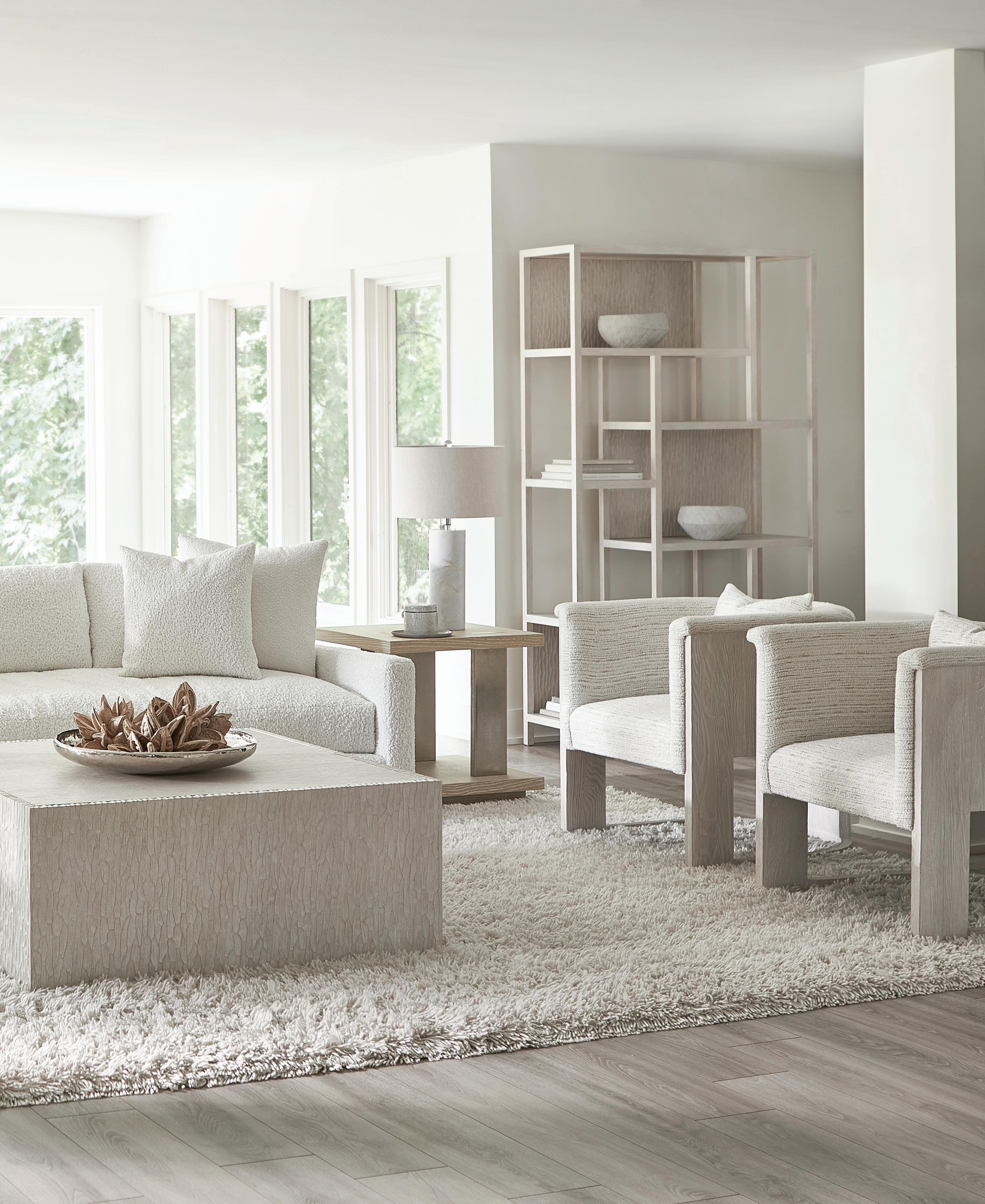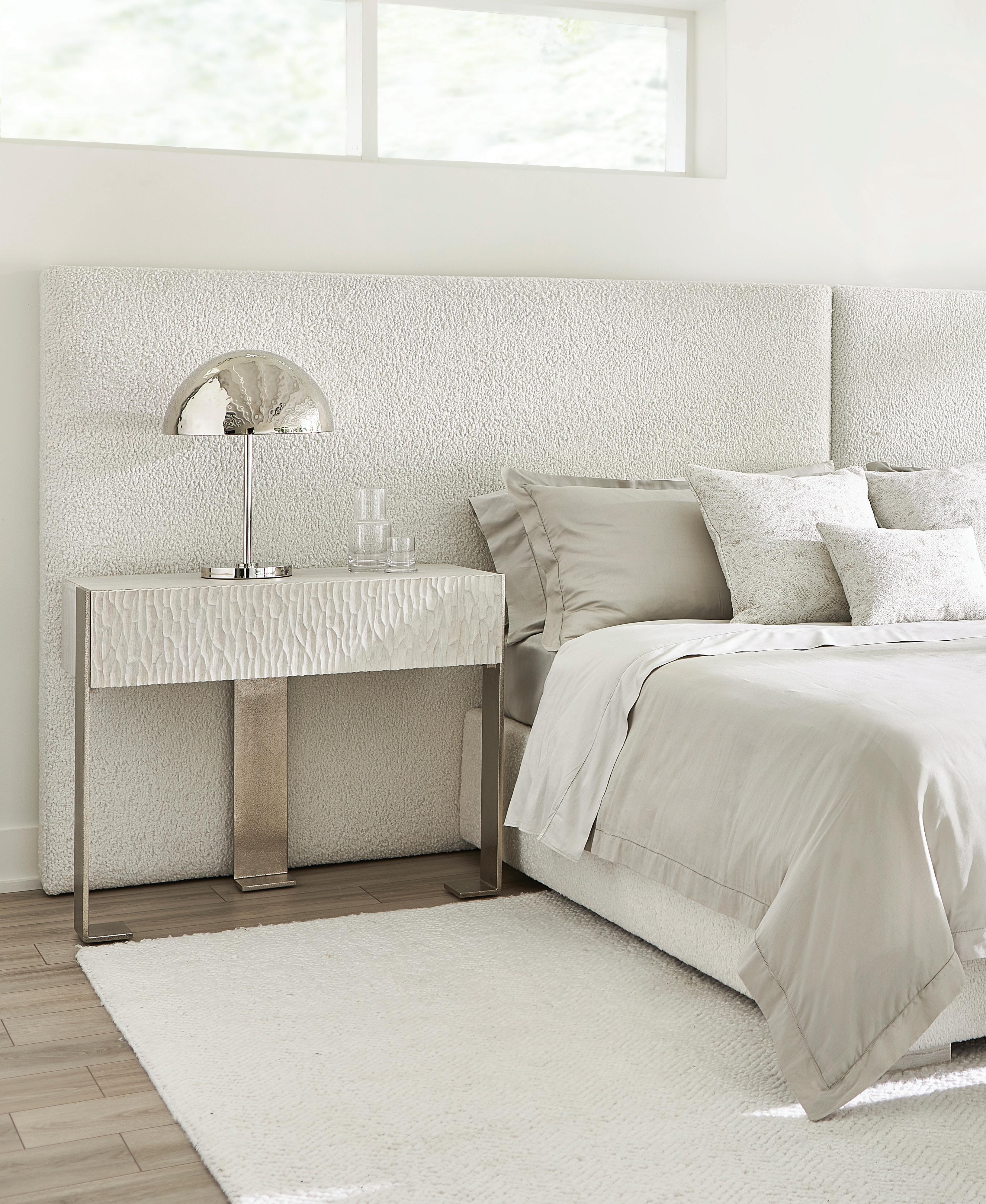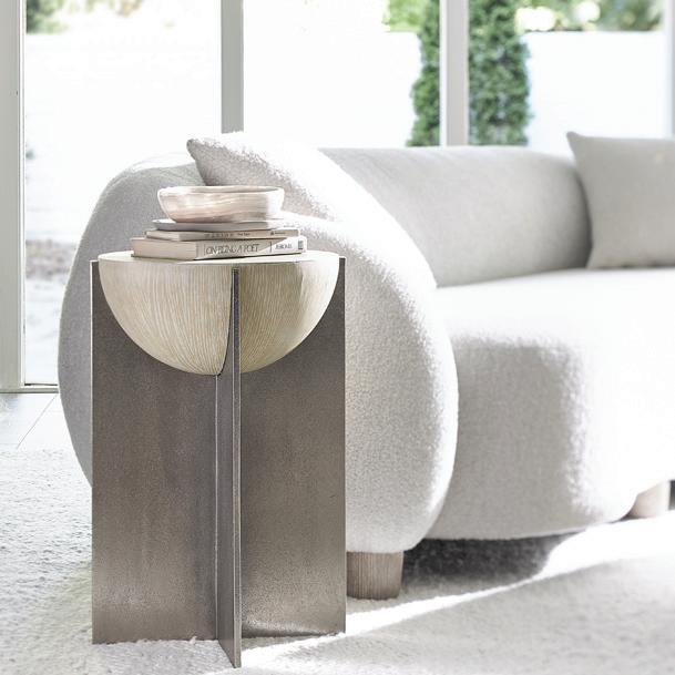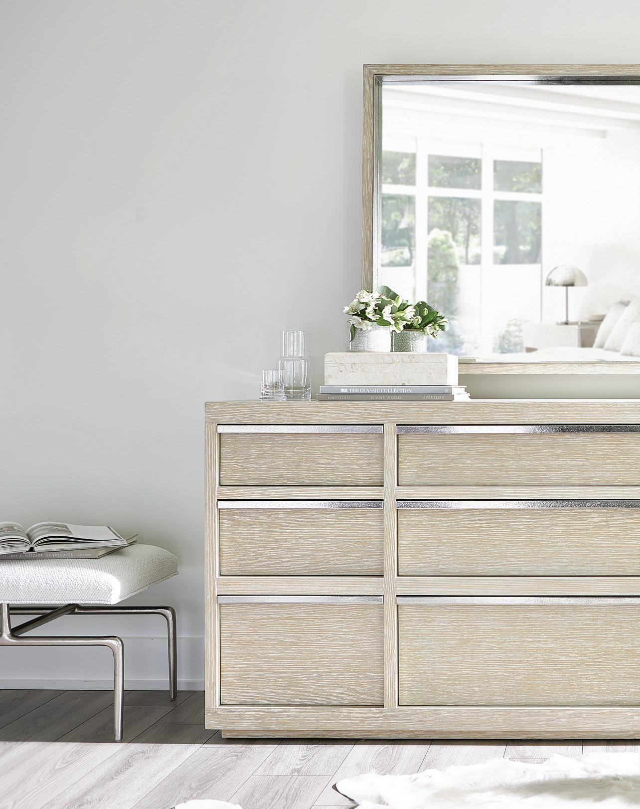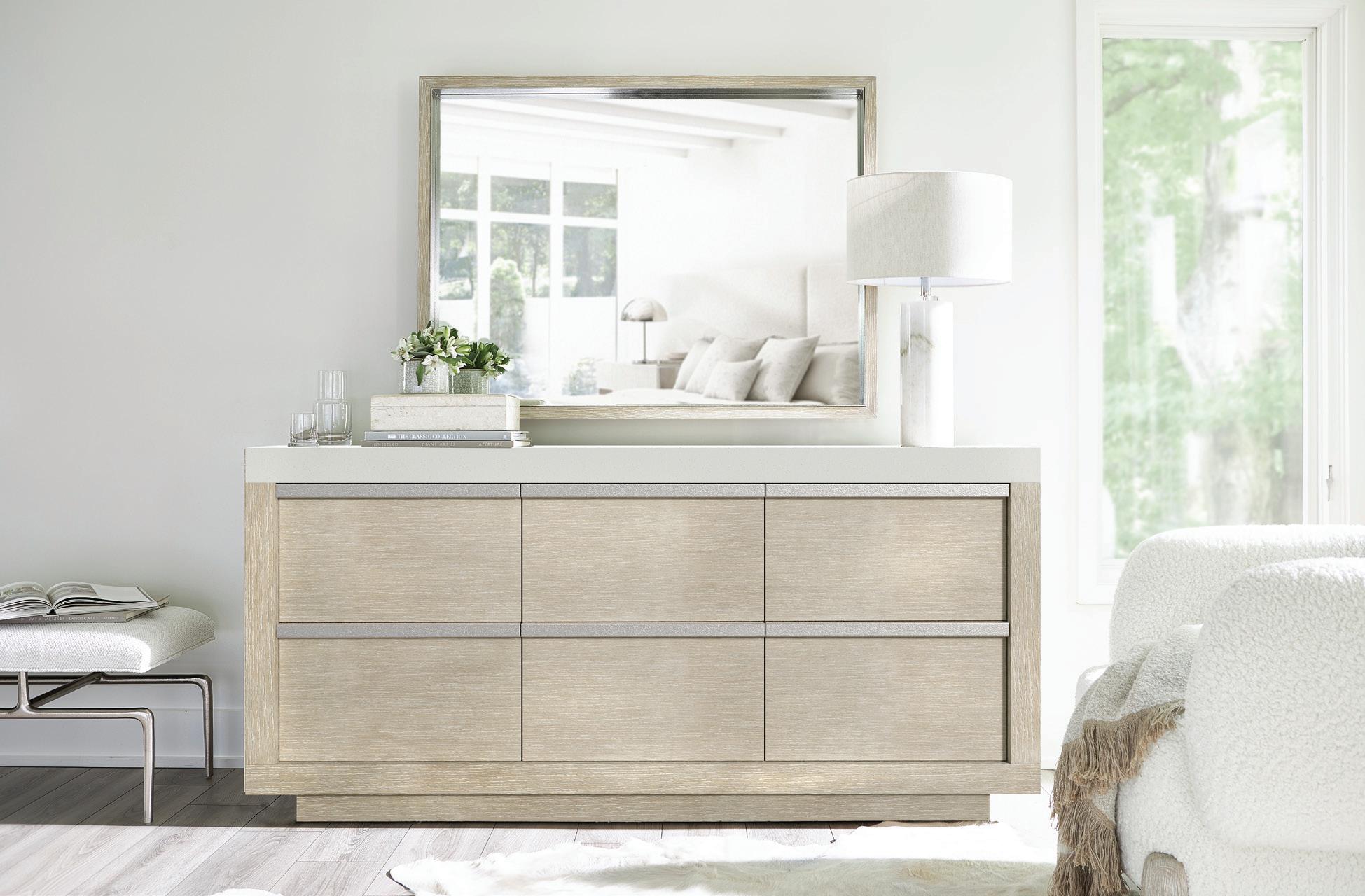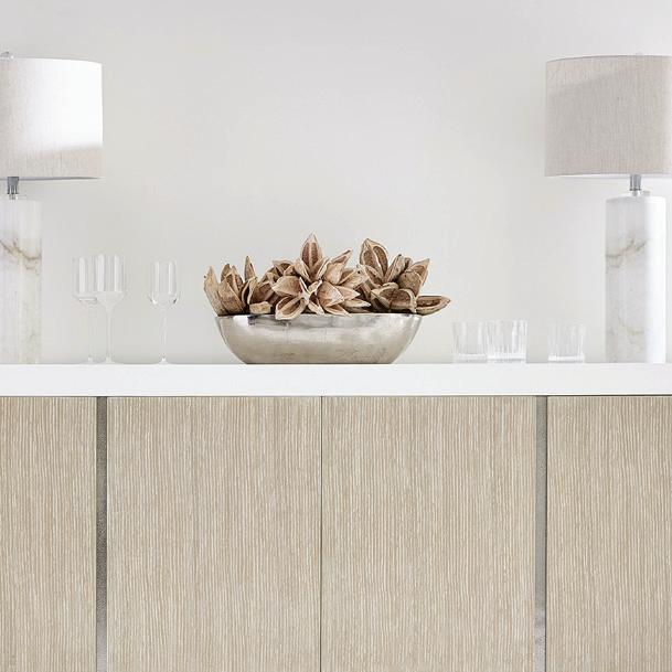 Defined by the beauty of simplicity, Solaria combines the clean lines of minimalism with layers of texture in a tonal palette of washed natural hues. Unadorned profiles are built with flawless craftsmanship, combining wire-brushed oak, stone and chiseled surfaces with rustic cast aluminum. The look is refreshing and uncluttered, building on modernist style with an elevated aesthetic and tactile wood grain. Geometrics and smooth surfaces offer hints of Bauhaus influence, while shearling adds warmth and softness. Innovative use of space and form lend subtle definition and drama to weightless open frames, floating shapes and an expanded headboard. Materials find the light in pale shades of limestone, sand, bone and wheat with understated contrast. The collection is sophisticated, but relaxed and unpretentious with an elemental, reflective purity