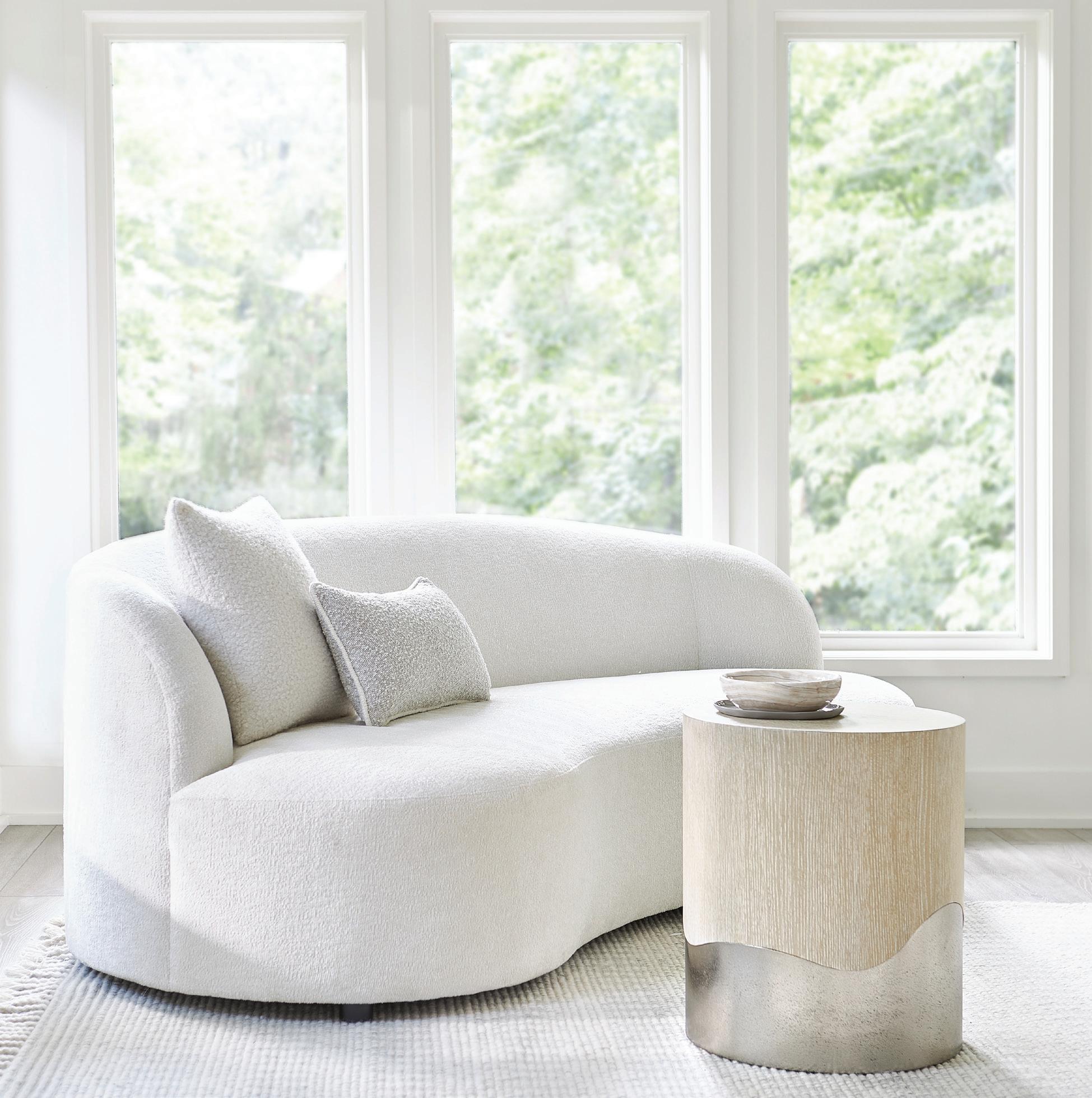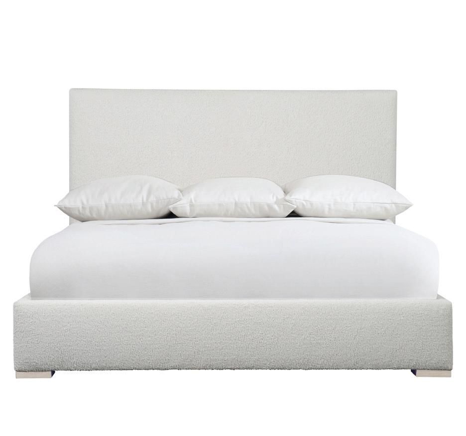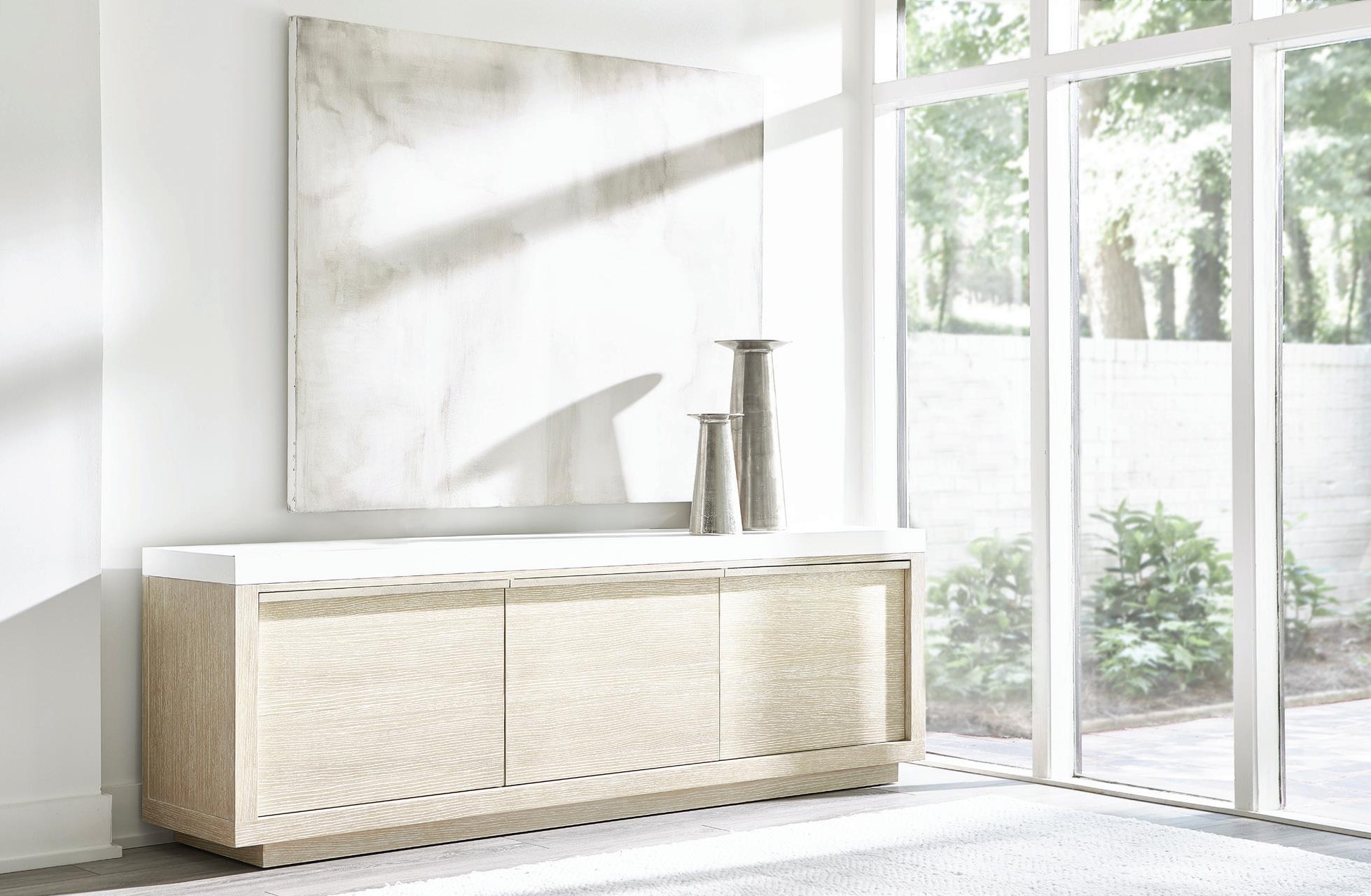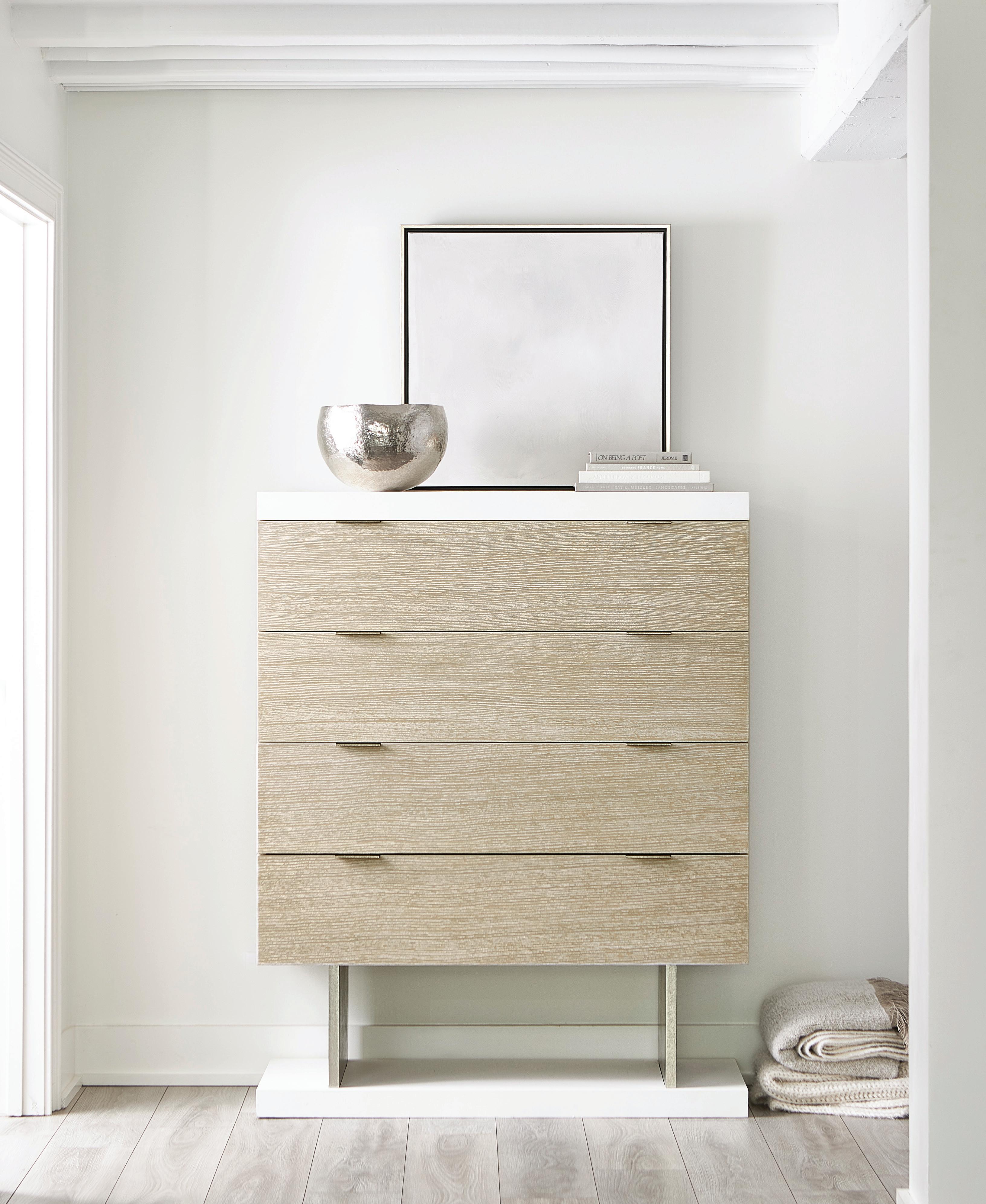 Defined by the beauty of simplicity, Solaria combines the clean lines of minimalism with layers of texture in a tonal palette of washed natural hues. Unadorned profiles are built with flawless craftsmanship, combining wire-brushed oak, stone and chiseled surfaces with rustic cast aluminum. The look is refreshing and uncluttered, building on modernist style with an elevated aesthetic and tactile wood grain. Geometrics and smooth surfaces offer hints of Bauhaus influence, while shearling adds warmth and softness. Innovative use of space and form lend subtle definition and drama to weightless open frames, floating shapes and an expanded headboard. Materials find the light in pale shades of limestone, sand, bone and wheat with understated contrast. The collection is sophisticated, but relaxed and unpretentious with an elemental, reflective purity