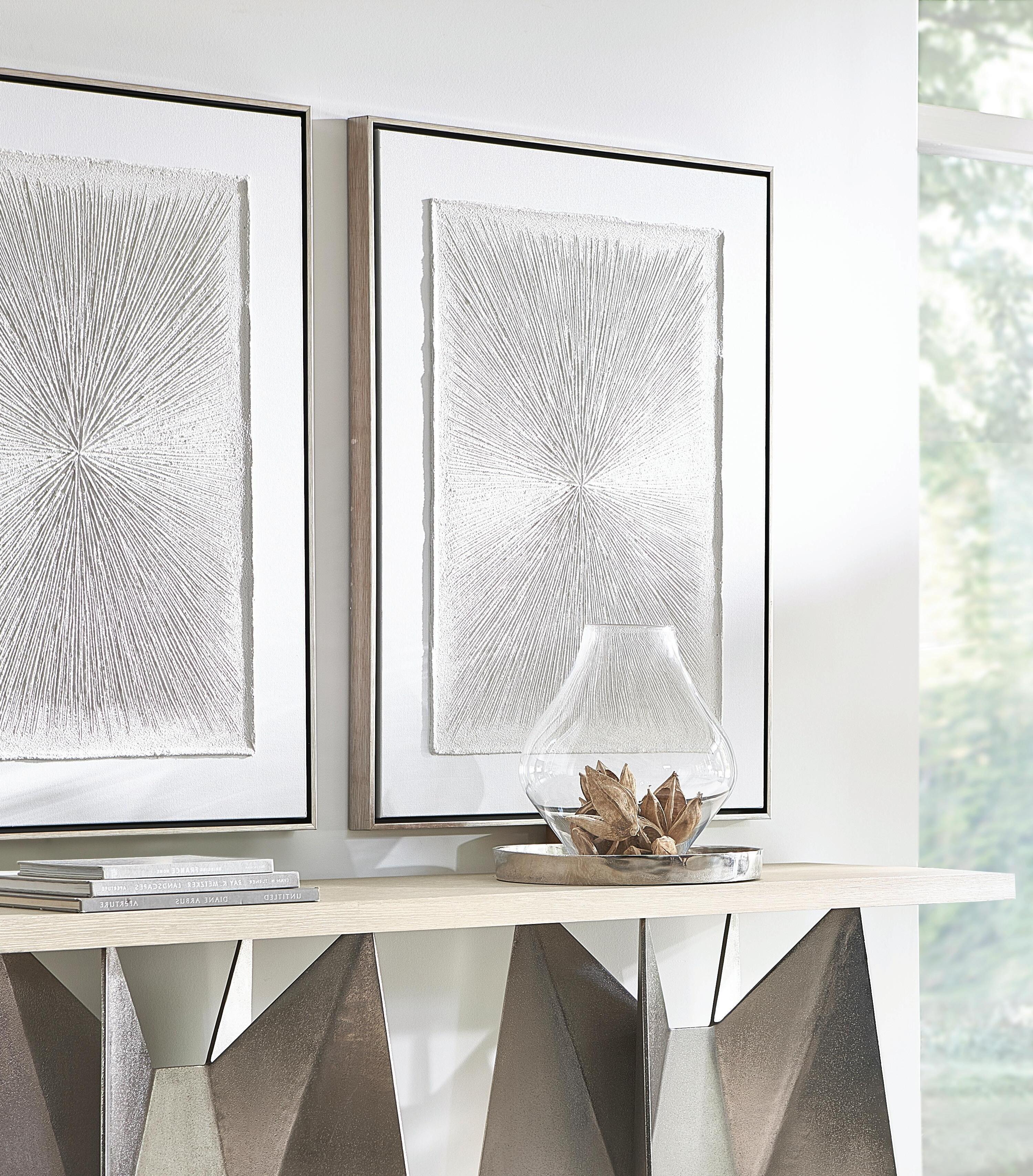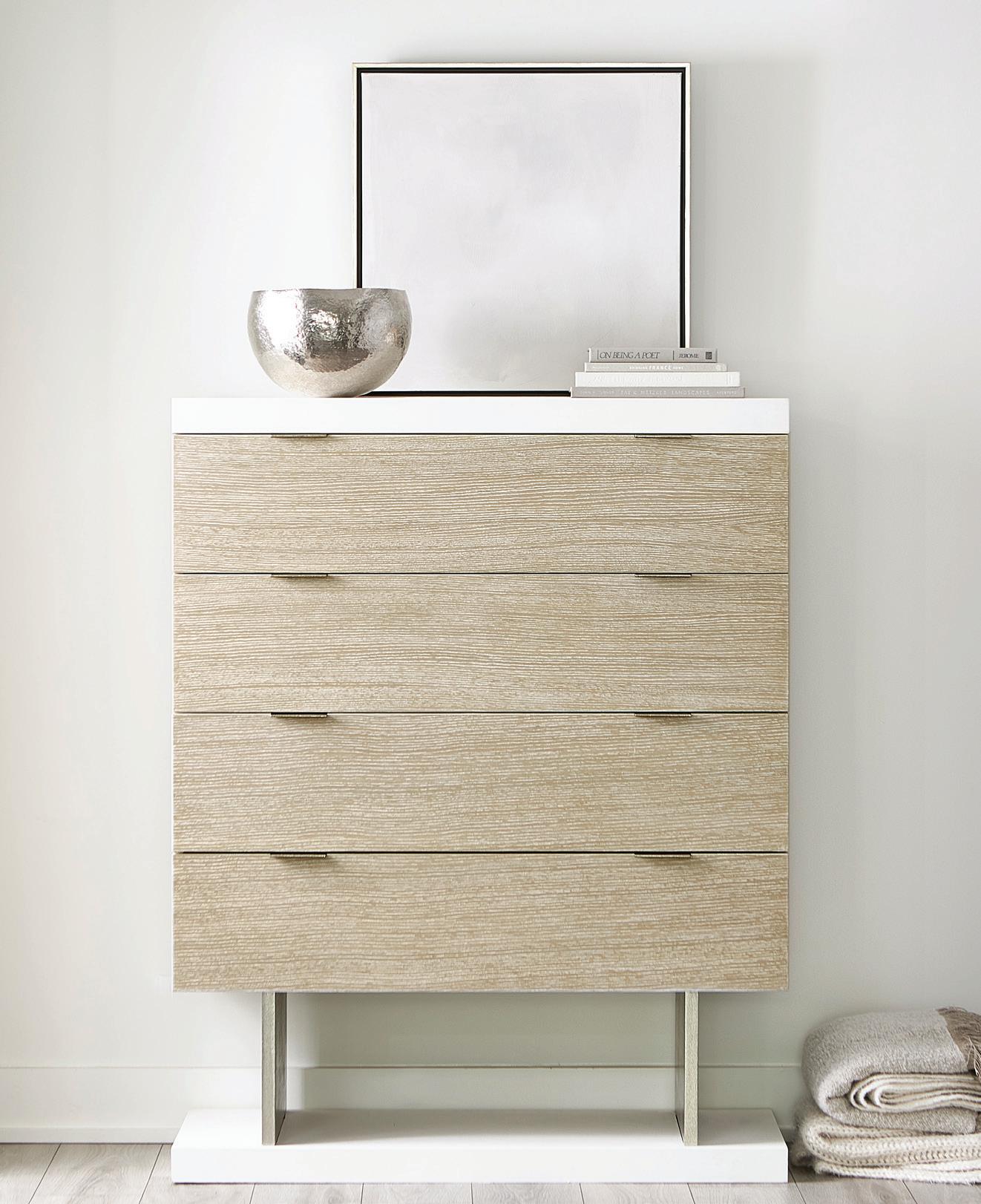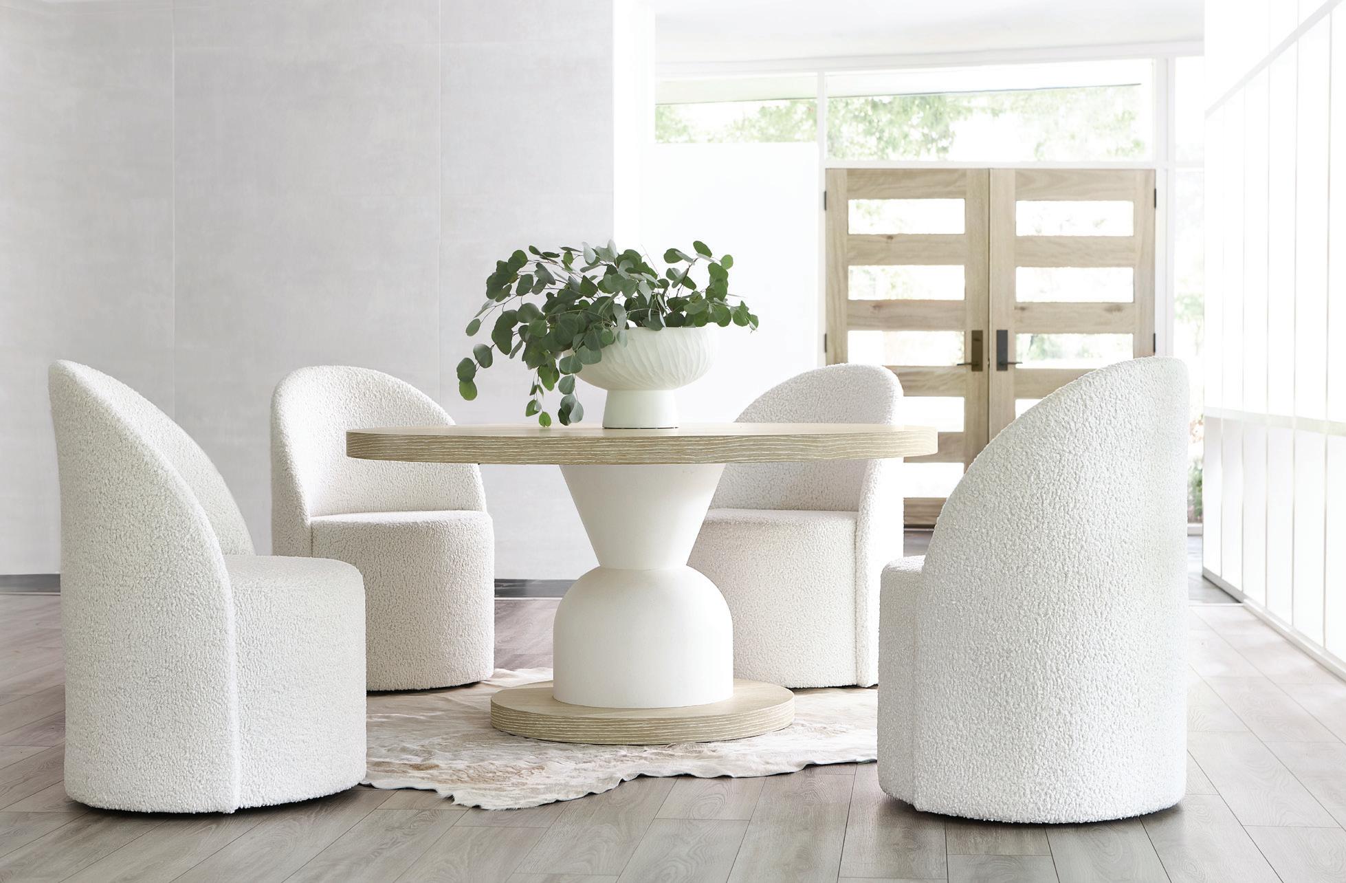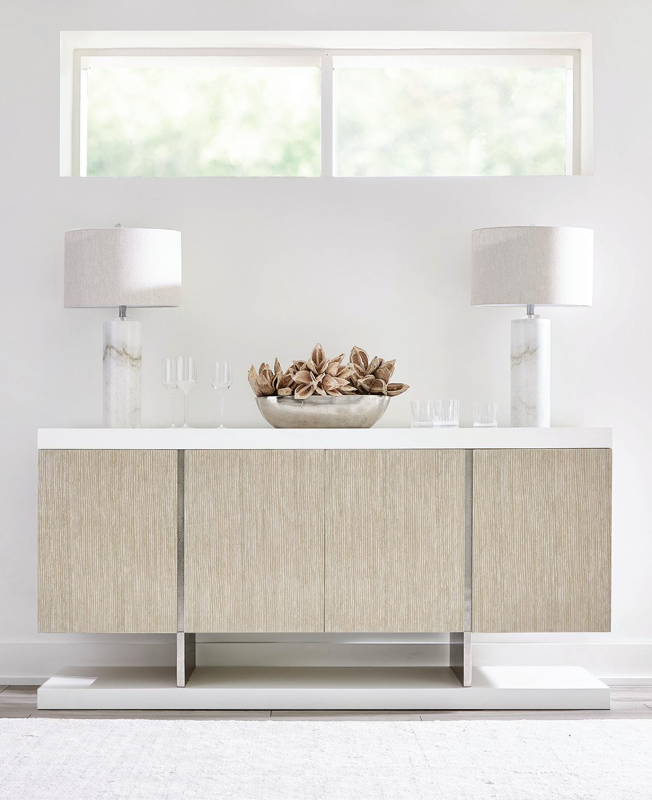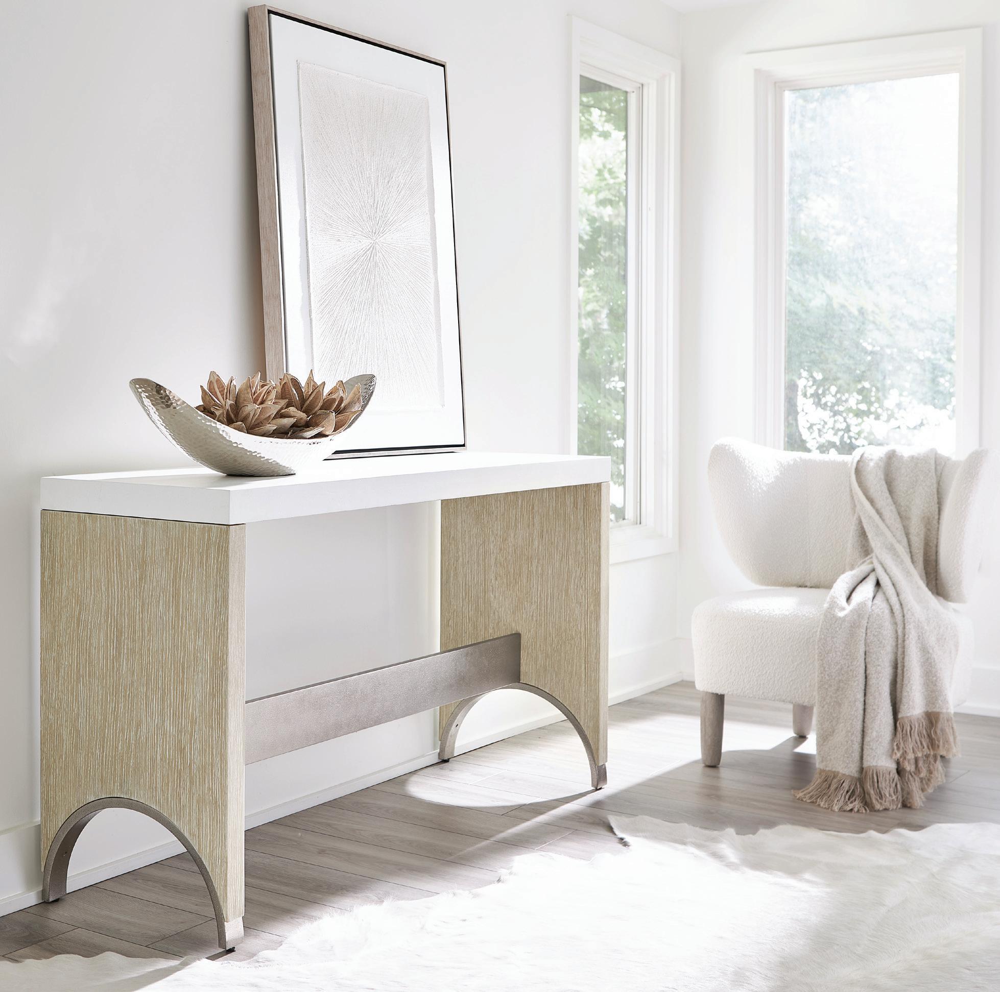 Defined by the beauty of simplicity, Solaria combines the clean lines of minimalism with layers of texture in a tonal palette of washed natural hues. Unadorned profiles are built with flawless craftsmanship, combining wire-brushed oak, stone and chiseled surfaces with rustic cast aluminum. The look is refreshing and uncluttered, building on modernist style with an elevated aesthetic and tactile wood grain. Geometrics and smooth surfaces offer hints of Bauhaus influence, while shearling adds warmth and softness. Innovative use of space and form lend subtle definition and drama to weightless open frames, floating shapes and an expanded headboard. Materials find the light in pale shades of limestone, sand, bone and wheat with understated contrast. The collection is sophisticated, but relaxed and unpretentious with an elemental, reflective purity