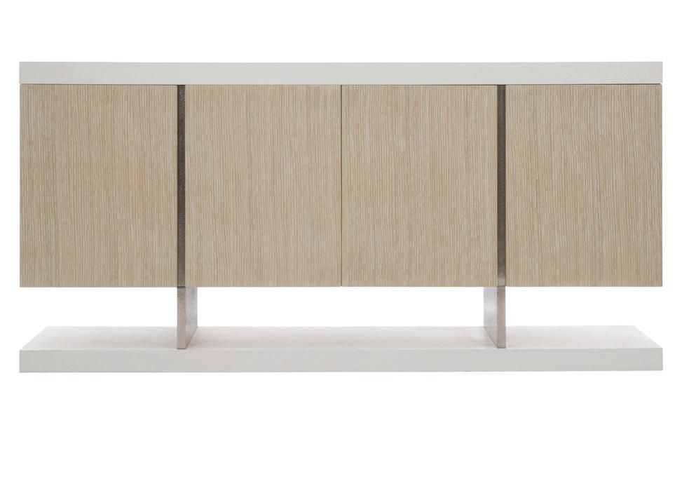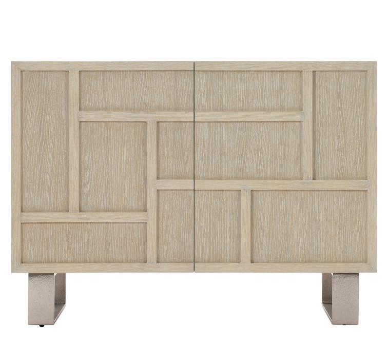 Two soft-close doors with wood overlays and finger pulls. Behind each door are two adjustable/ removable shelves. Dune finish. Cast aluminum legs in Shiny Nickel finish. Adjustable glides. Anti-tip kit.