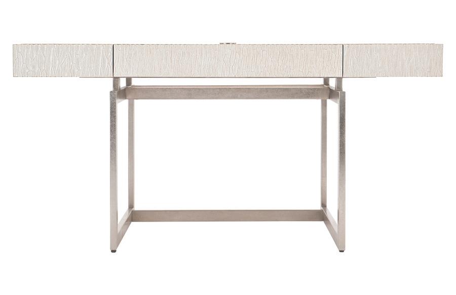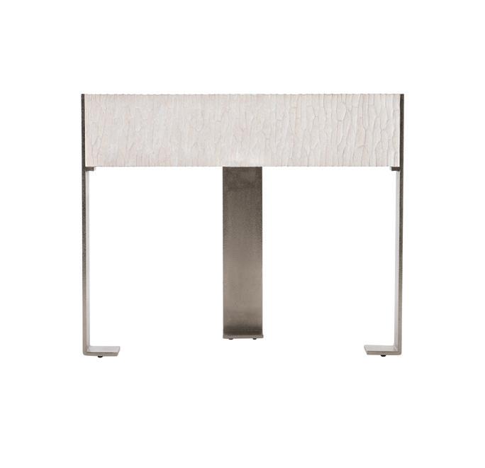 Cast chiseled pattern in Weathered Bone finish on all sides. Grommet hole with cover on top. One center drawer with drop front and finger pull. Behind center drawer is an electrical box with two USB ports and two receptacles. Metal base in Shiny Nickel finish with stretchers.