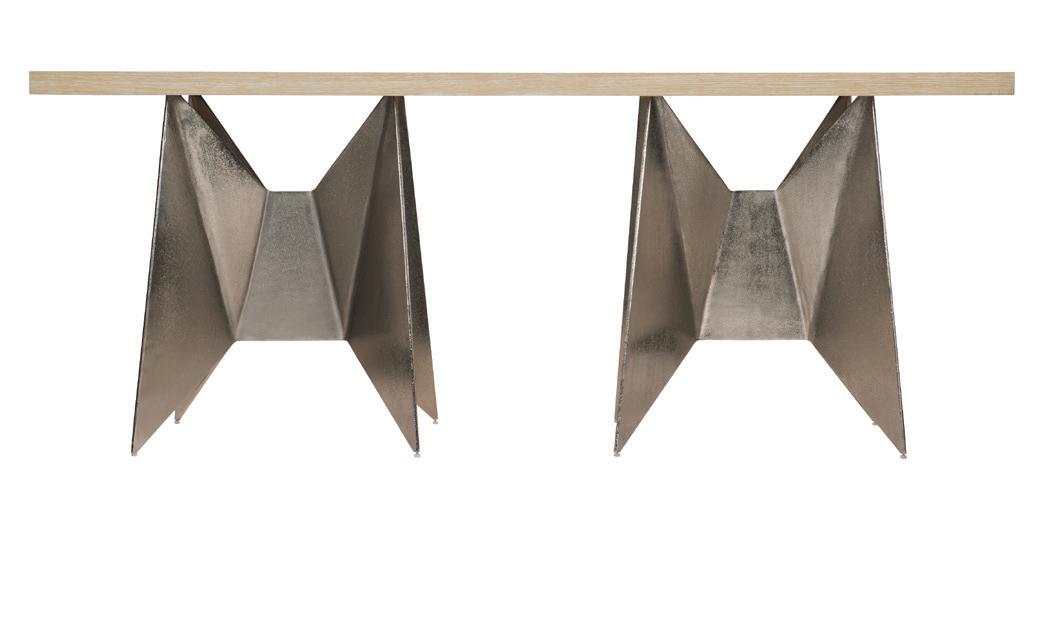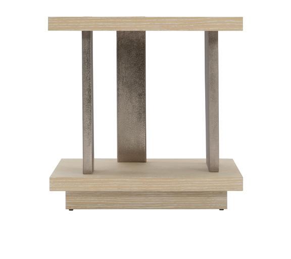 Two geometric shaped cast aluminum bases in Shiny Nickel finish. Wood top in Dune finish. Small adjustable glides.