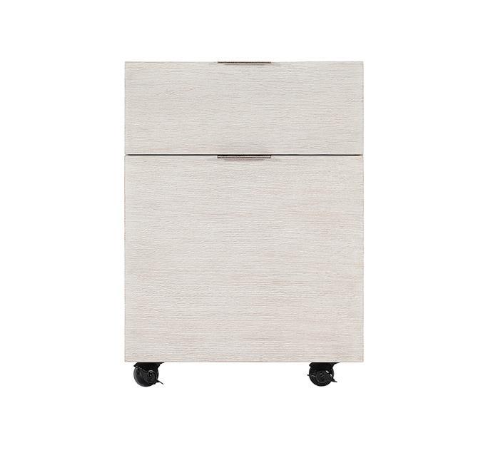 Two drawers. Bottom drawer has removable hanging rods for letter or legal files. Front nonmarring casters have locking feature. Weathered Bone finish.