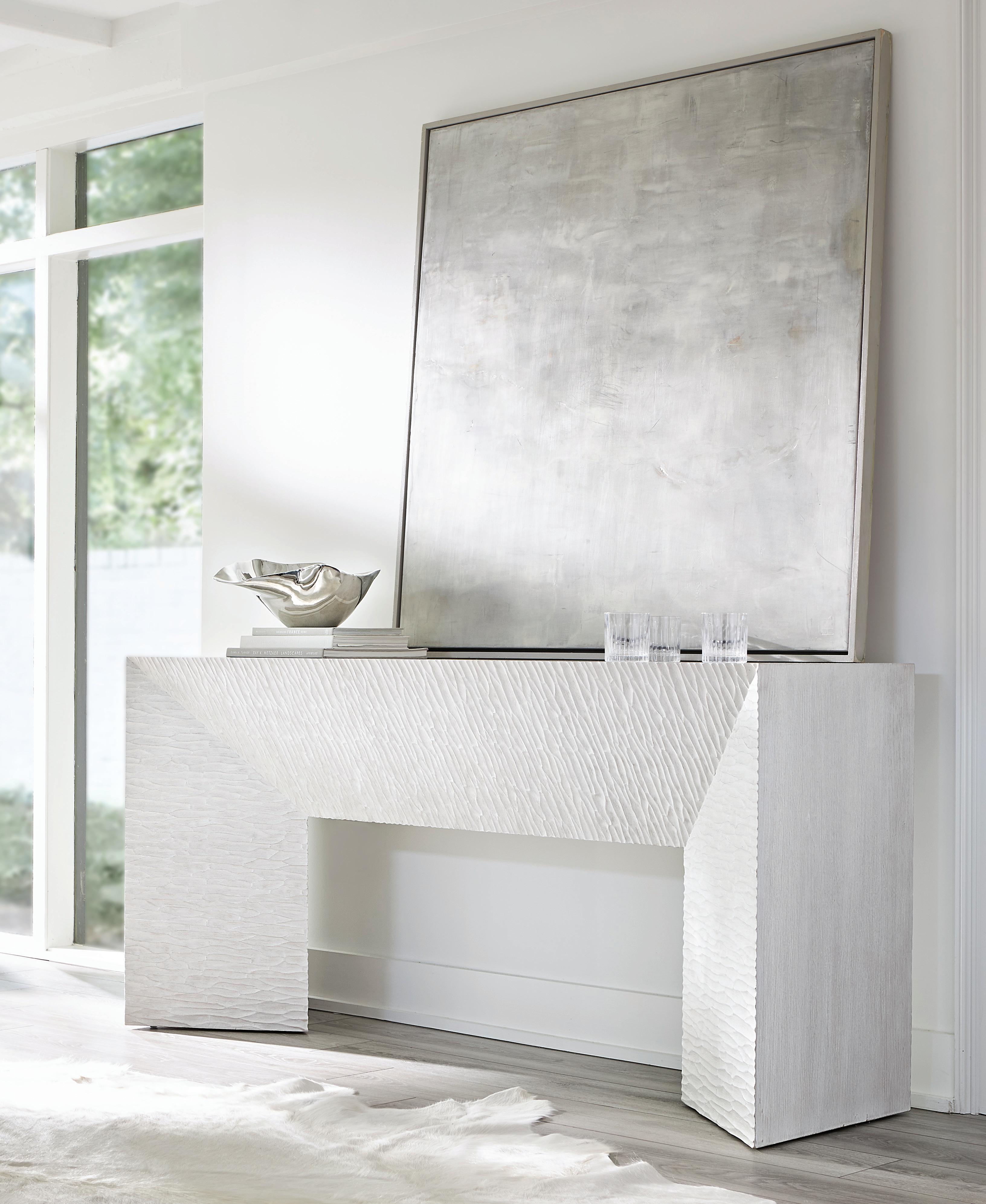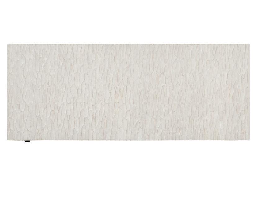 Quartered white oak veneers on top and ends. Front and back of cast resin with chiseled pattern. Adjustable glides. Anti-tip kit. Weathered Bone finish.