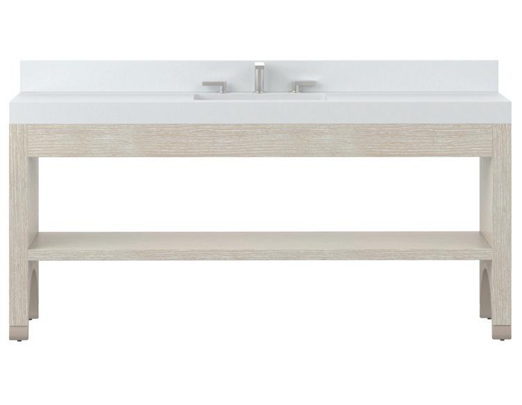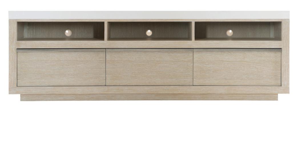 Faux stone top in Fossil finish. Three open front compartments, each with one grommet hole with cover. Three self/soft-closing drawers. Plinth base. Adjustable glides. Anti-tip kit. Dune finish on case.