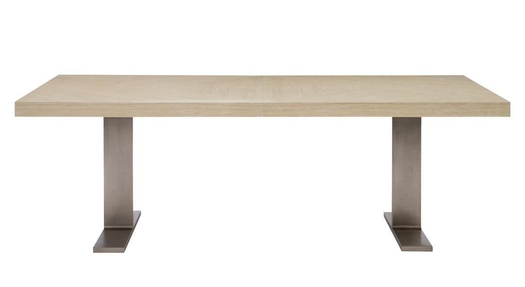 Cast faux stone top in Fossil finish. Cast aluminum center stretchers and arched end panel base in Shiny Nickel finish. Dune finish on wood frame with arched end panels. Adjustable glides.