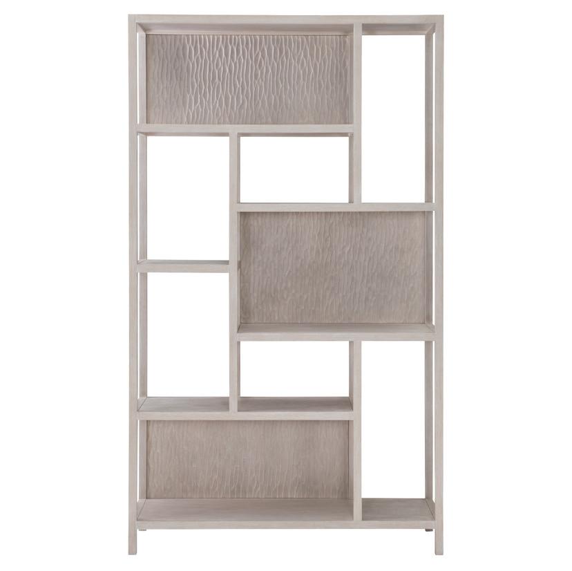 Open back, wood frame with staggered cast resin back panels in chiseled pattern design. Wood panel top and six wood shelves. Adjustable glides. Anti-tip kit. Weathered Bone finish.