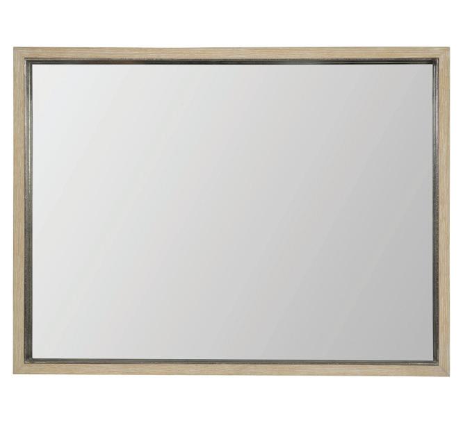 Wood-frame in Dune finish with inset cast aluminum frame in Shiny Nickel finish. Non-beveled mirrored glass.