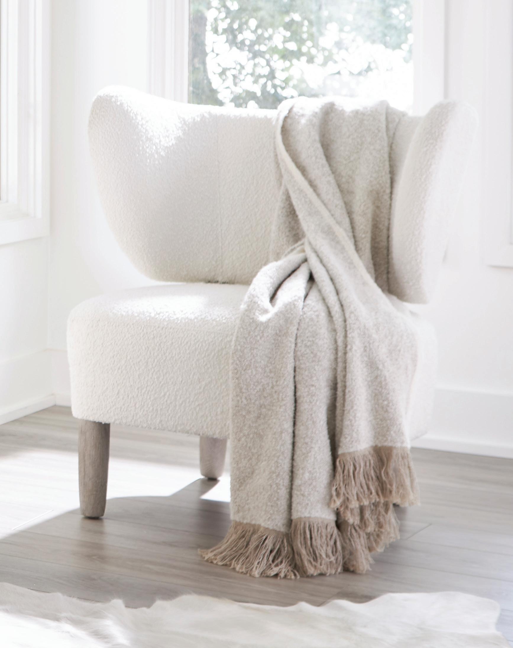 Wire-brushed, quartered white oak, chiseled cast resin and faux stone with hardware, accents and frames in rustic cast aluminum. Collection textiles include textural and woven fabrics in neutral ivory hues.