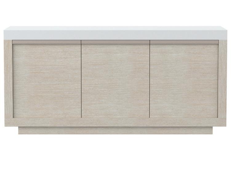 Faux stone top in Fossil finish. Three self/soft-closing doors. Plinth base. Adjustable glides. Anti-tip kit. Dune finish on case.