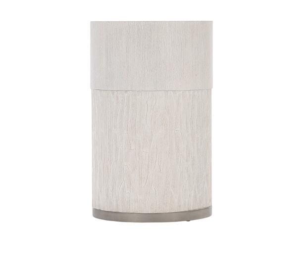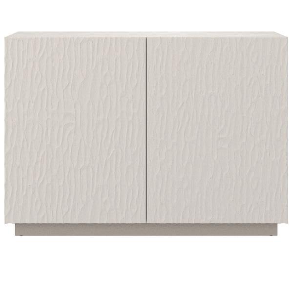 Two soft/self-close doors with cast chiseled fronts. Case in Weathered Bone finish. Plinth base.