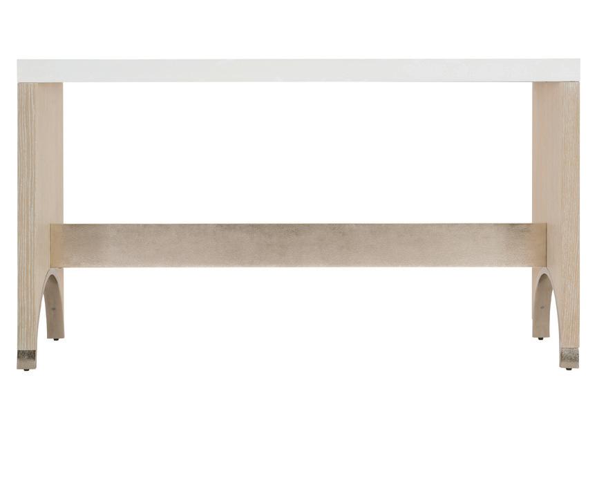 Cast faux stone top in Fossil finish. Dune finish on wood frame with arched end panels. Arched end panel base in Shiny Nickel finish. Adjustable glides.