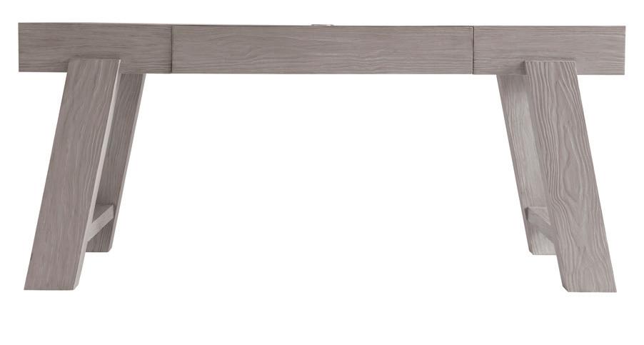 Gris finish on desk of pine solids and veneers. Covered metal grommet hole on center of top at back. One fully extendable drop-front drawer. Power strip mounted under top with two outlets and two USB ports.