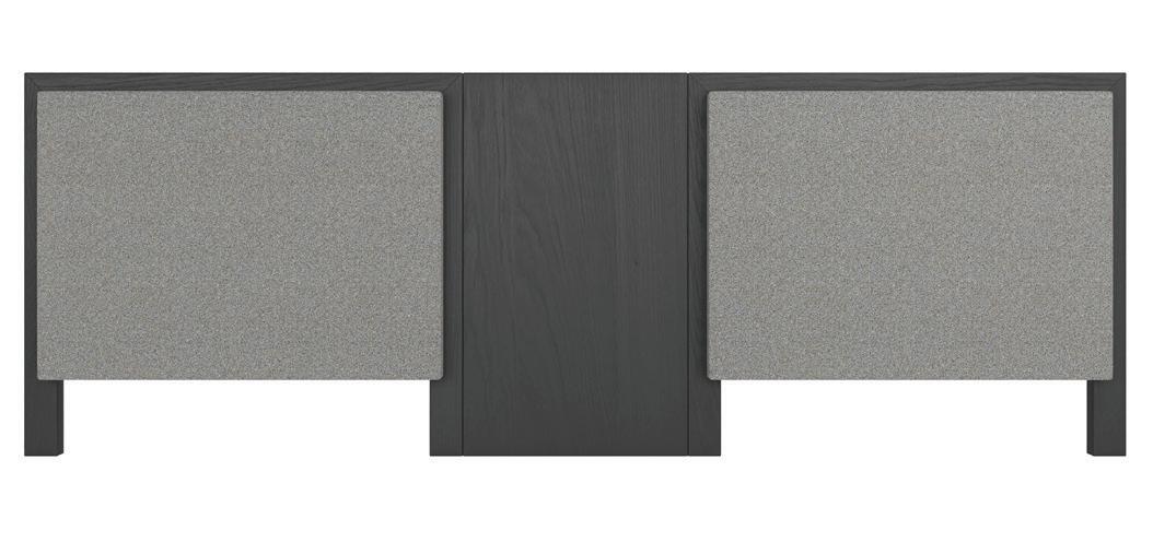 Engineered Contrast Ebony veneered case. Two touch-to-open doors. Behind left door is open space with back panel cut-out for fridge ventilation. Behind right door are three soft-closing drawers. Solid wood legs in L'Ombre finish. Adjustable glides. Anti-tip kit.