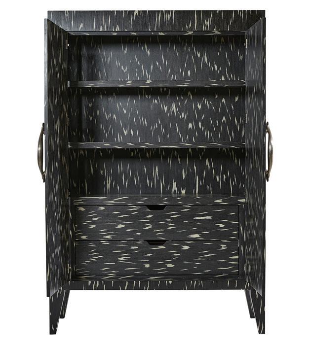 Engineered Contrast Ebony veneer. Two doors. Behind doors in the upper section is a compartment with two adjustable/removable shelves. Below the compartment is a fixed shelf surface. Underneath are two soft-close drawers with hand-pull cutout. Anti-tip kit.