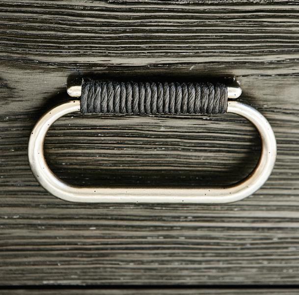 To the left is one soft-closing door. Behind door is open space with back panel cut-out for fridge ventilation. To the right are three soft-closing drawers. Metal hardware pulls wrapped with cord at the top of the pull. Solid wood legs. L'Ombre finish. Adjustable glides. Anti-tip kit.