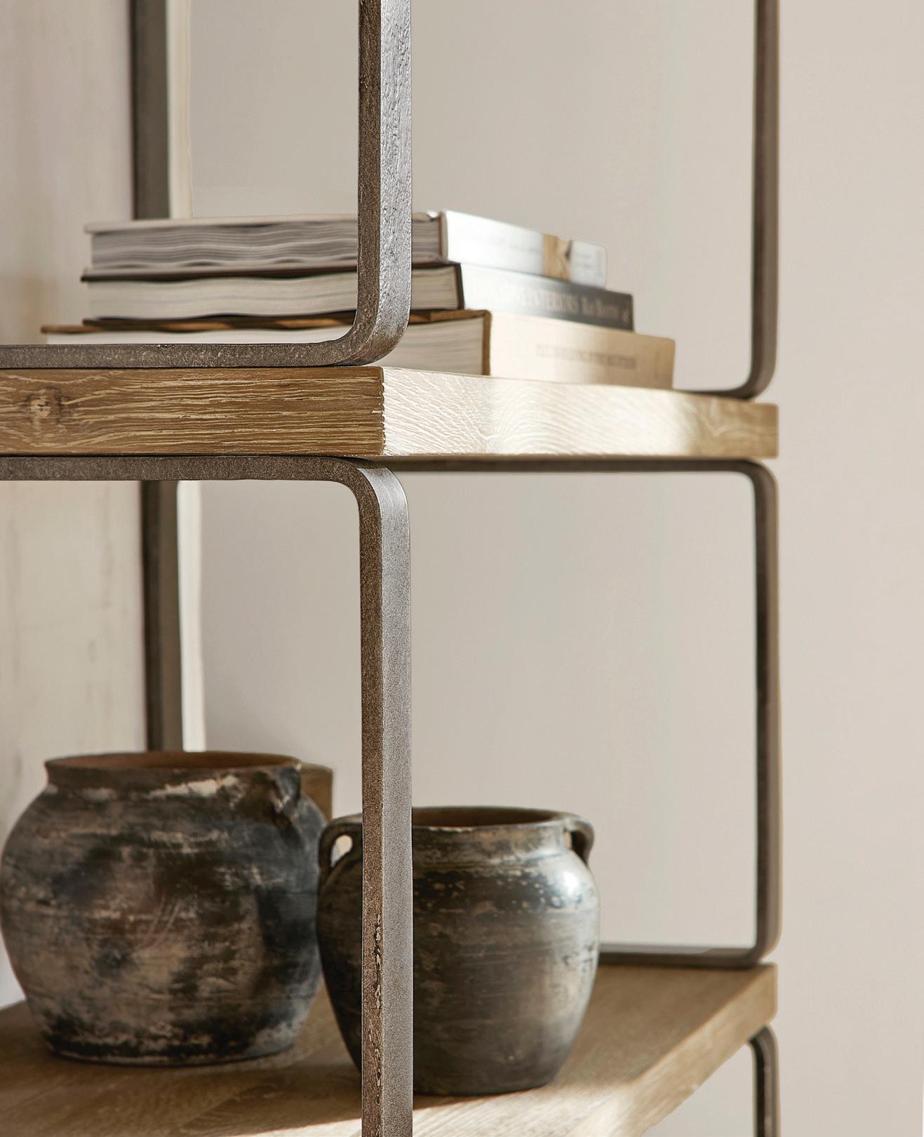 Wire-brushed oak etagere with five fixed shelves in Aurum finish. Applied texture steel frame squares in Barlow finish support each shelf. Anti-tip kit. Adjustable glides.