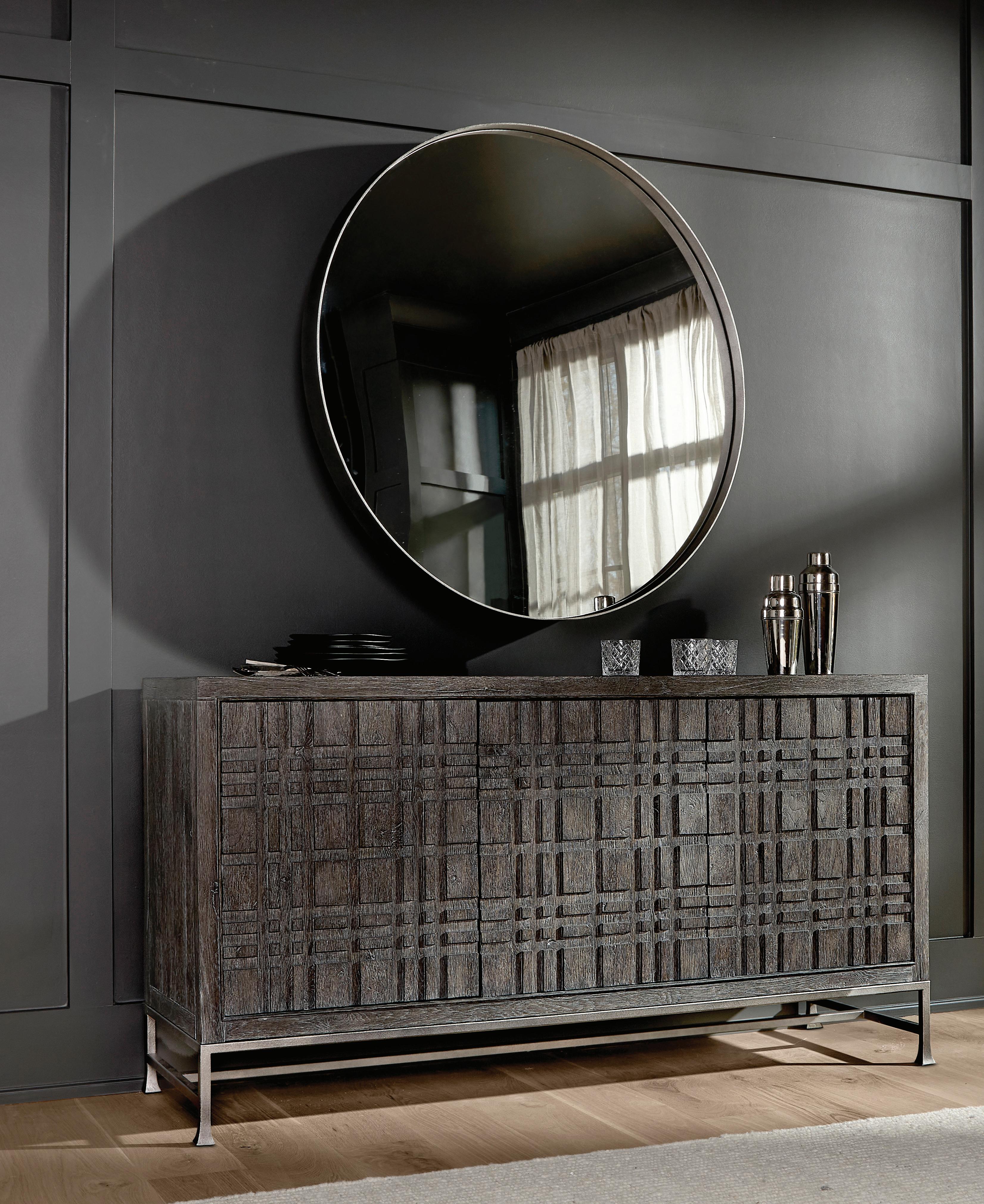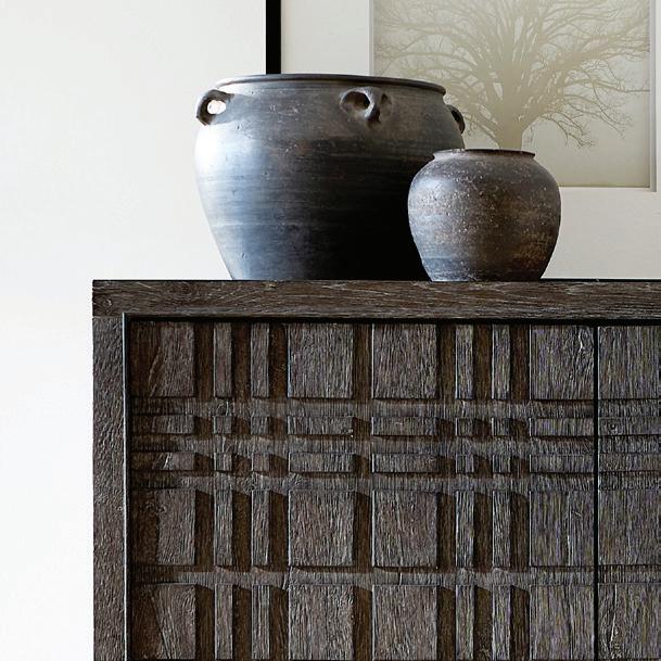Wire-brushed oak case in Tadon finish. Three push-to-open, soft-close doors with raised geometric pattern. Behind doors are covered grommets and vents, two adjustable shelves, two fixed shelves and two pull-to-open, soft-close drawers containing one silverware insert and one wrapped pad. Applied texture steel base in Barlow finish. Anti-tip kit. Adjustable glides. Note: Not designed to support TV and/or other media.