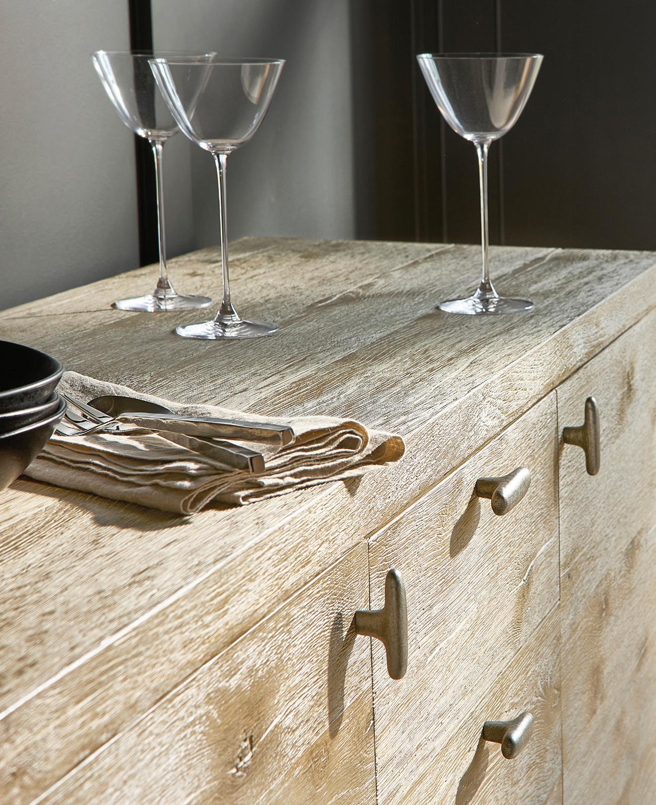 Wire-brushed oak case in Aurum finish. Two pull-to-open, soft-close doors concealing four adjustable shelves. Three pull-to-open, soft-close drawers with one silverware insert and two wrapped pads. Applied texture steel base and pulls in Barlow finish. Anti-tip kit. Adjustable glides.