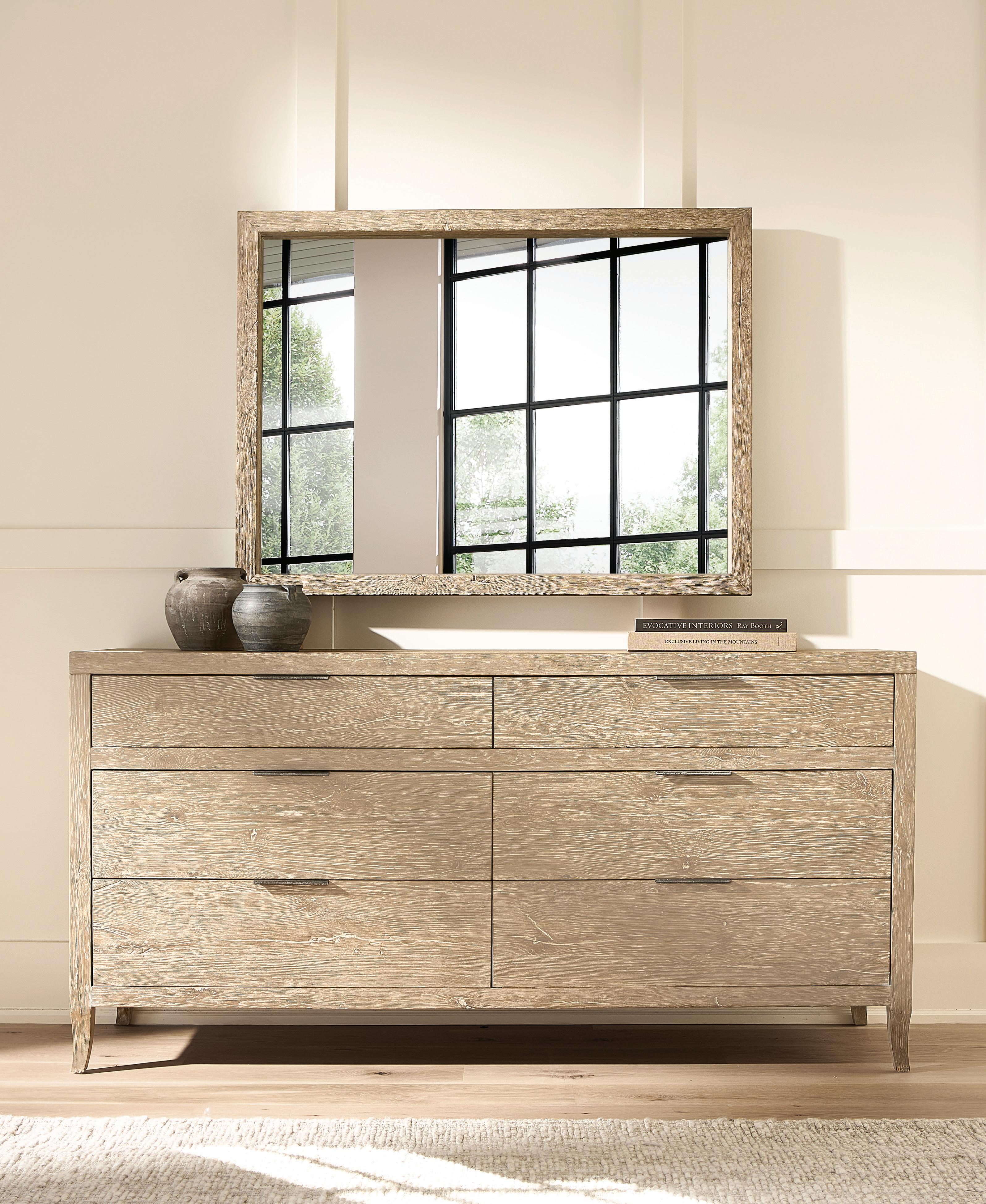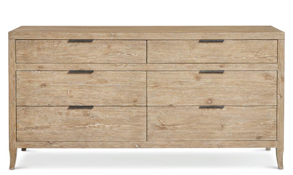 Wire-brushed oak case in Aurum finish. Six pull-to-open, soft-close drawers with applied texture tab pulls in Barlow finish. Anti-tip kit. Adjustable glides. Note: Not designed to support TV and/or other media.