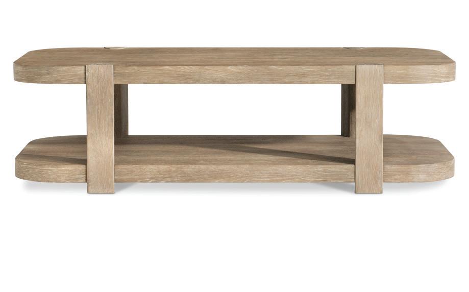 Wire-brushed oak case in Aurum finish. Two pull-to-open, soft-close drawers with applied texture tab pulls in Barlow finish. Open bottom shelf. Two port A+C USB charging unit. Anti-tip kit. Adjustable glides.