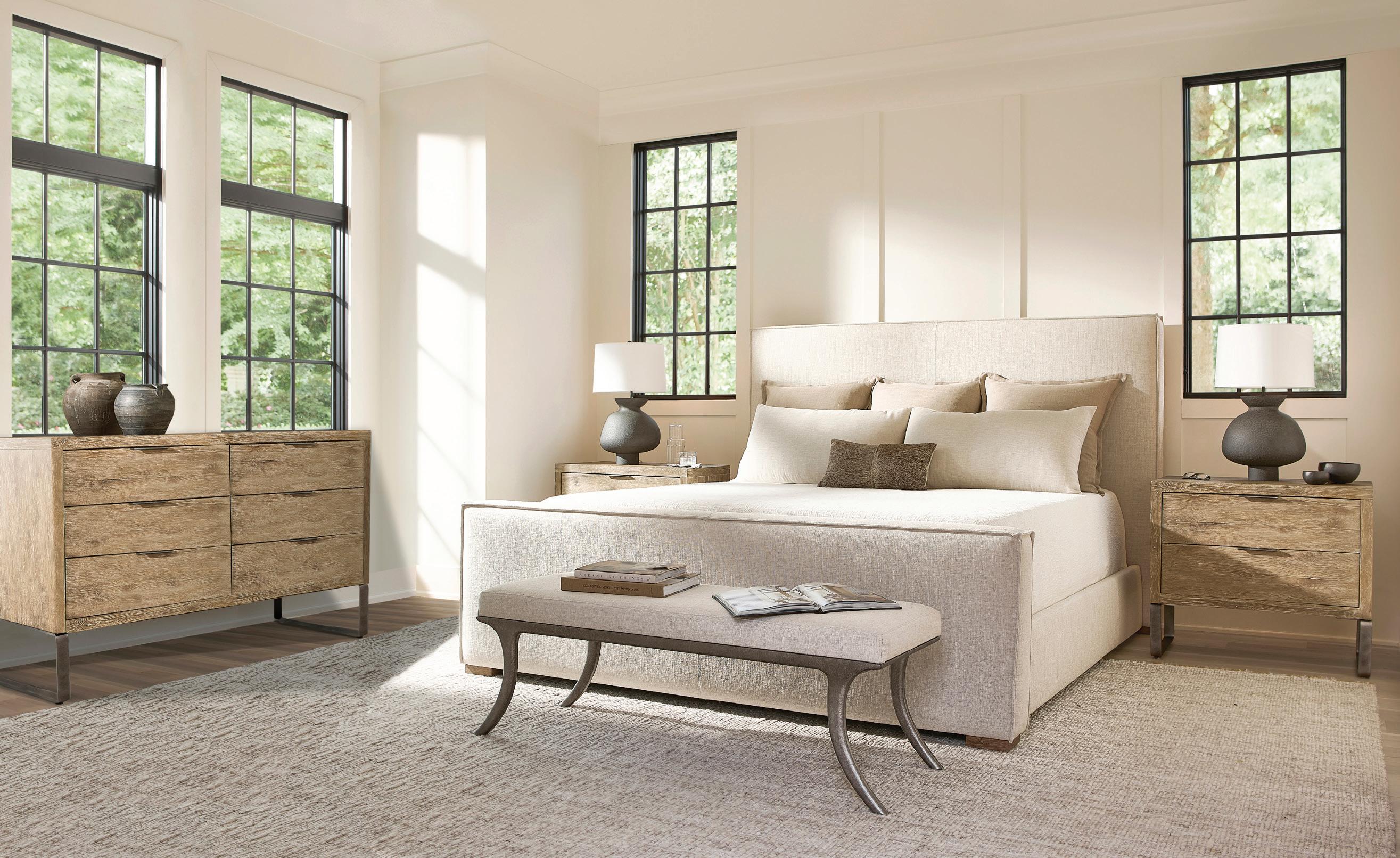 PAGES 22-23: 333H09/333FR09 Panel Bed (Fabric B129), 333506 Bench (Fabric B129), 333229 Nightstands, N2401O Aspen Ottomans.