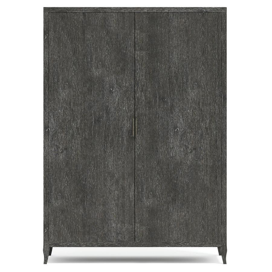 Wire-brushed oak case in Tadon finish. Four push-to-open, soft-close cast resin doors with raised geometric pattern. Behind left and right doors are two adjustable shelves, vents and grommet holes. Behind paired center doors are vents, grommet holes, four shelves divided by a partition and two pull-to-open drawers. Applied texture steel base in Barlow finish. Anti-tip kit. Adjustable glides.