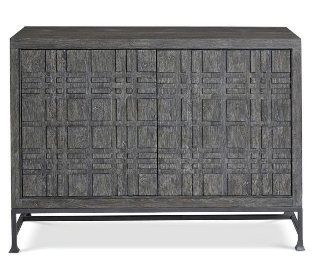 Wire-brushed oak case in Tadon finish. Two adjustable shelves behind each push-to-open, soft-close door with raised geometric pattern front. Applied texture steel base in Barlow finish. Adjustable glides.