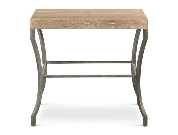 Square, wire-brushed oak top in Aurum finish. Textured steel base with stretcher in Barlow finish. Adjustable glides.