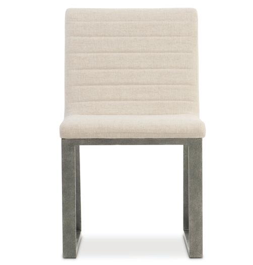 Upholstered back and seat. Horizontal channels on inback and seat. Applied texture aluminum sled frame in Barlow finish. White dome glides. Also available in other fabrics excluding leathers, silks and pillow fabrics; order as 333X42.