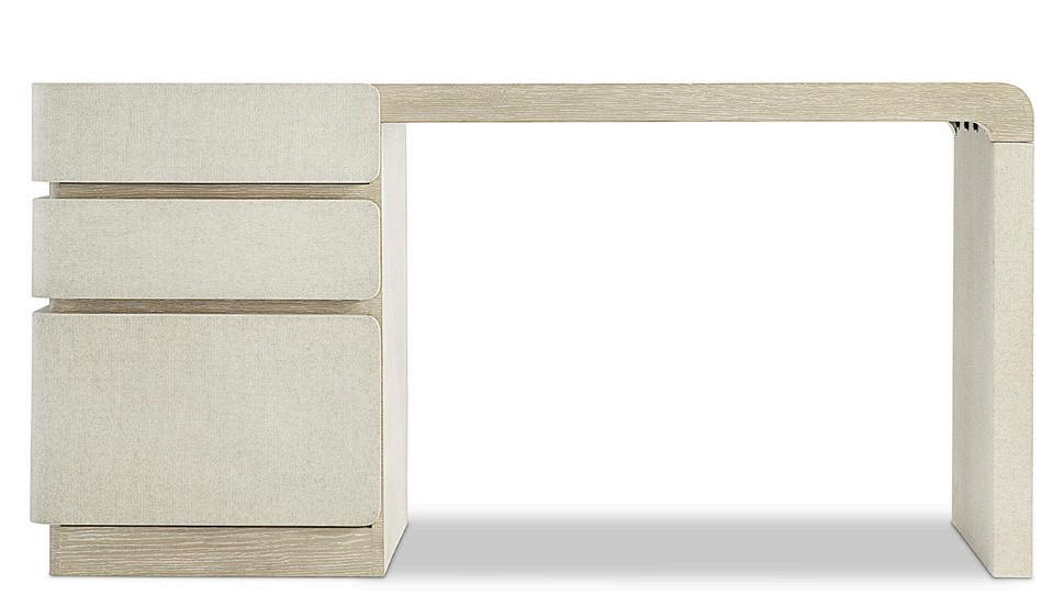 Wire-brushed quartered white oak desk with three wraparound design soft-close drawers with finger pull in Clay finish. Raffia-wrapped end panel and drawer fronts in Silt finish. Plinth base.