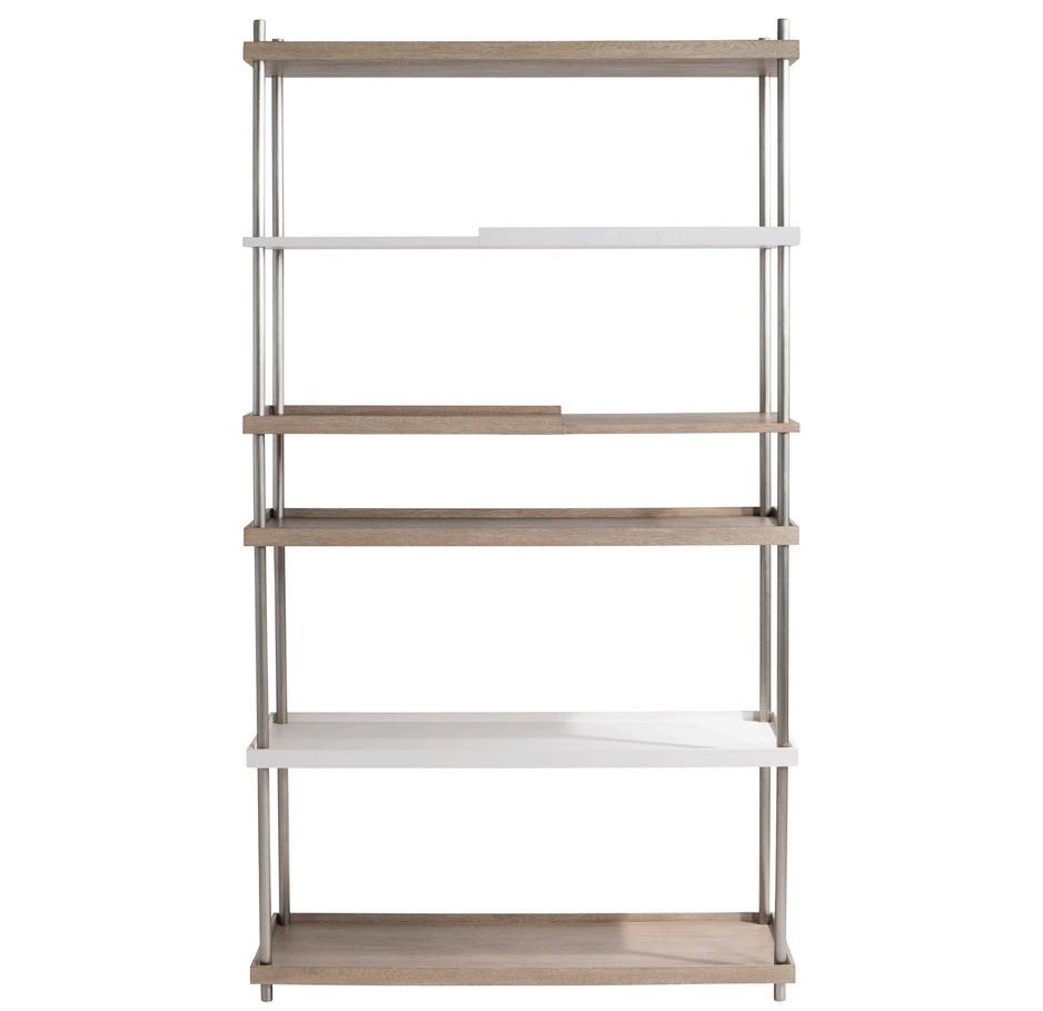 Stainless steel frame in Brushed Silver finish. Five wood shelves and veneered center back panel in Linear Grey finish.