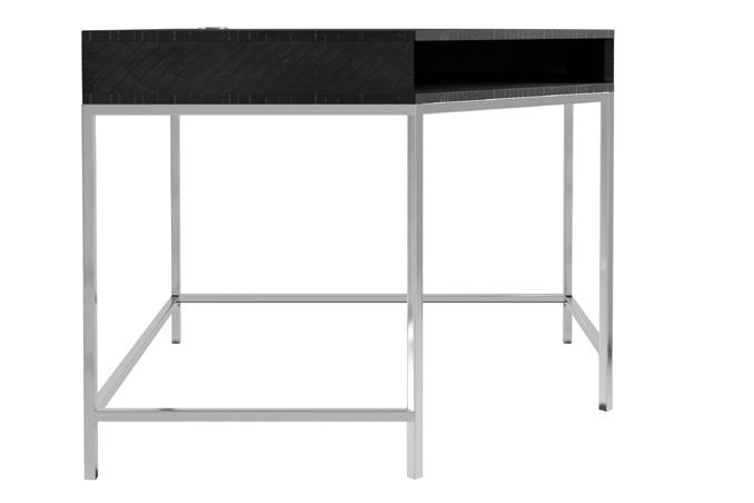 Planked solid pine top in Cinder finish with metal grommet hole with cover. One drawer along the 45 degree angle. Polished stainless steel base and stretchers in Grey Mist finish.
