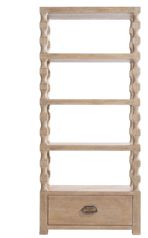 Marcona finish on open etagere with four shaped, cast resin posts. Wood top panel, three fixed shelves and one fixed shelf surface with drawer at bottom. Metal tab pull on drawer in Frosted Nickel finish.