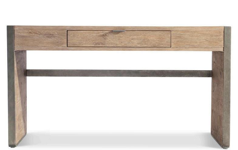 Wire-brushed white oak desk in Aurum finish. One pull-to-open drawer with metal tab in Barlow finish. Wood support panels framed in textured steel in Barlow finish, with steel stretcher in Barlow finish.