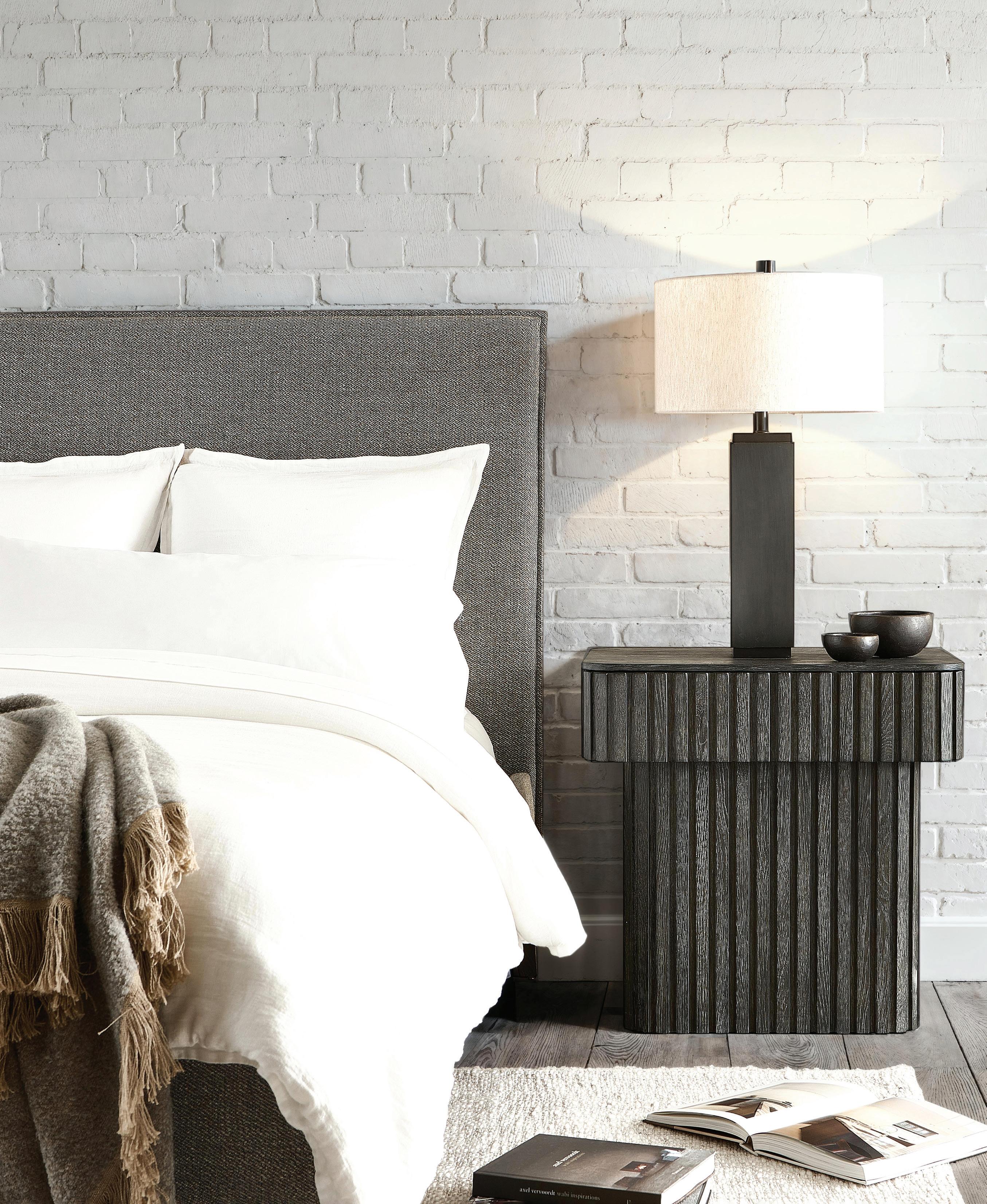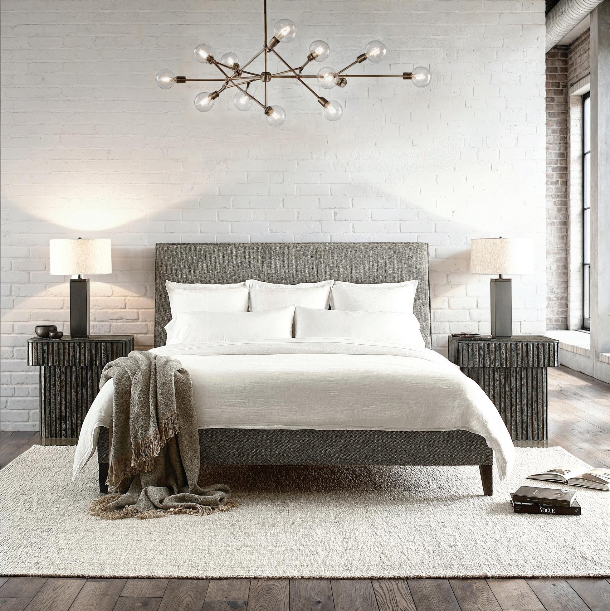 COVER: 352FR09 / 352H09 Panel Bed (Fabric B145), 352219 Menton Nightstands.