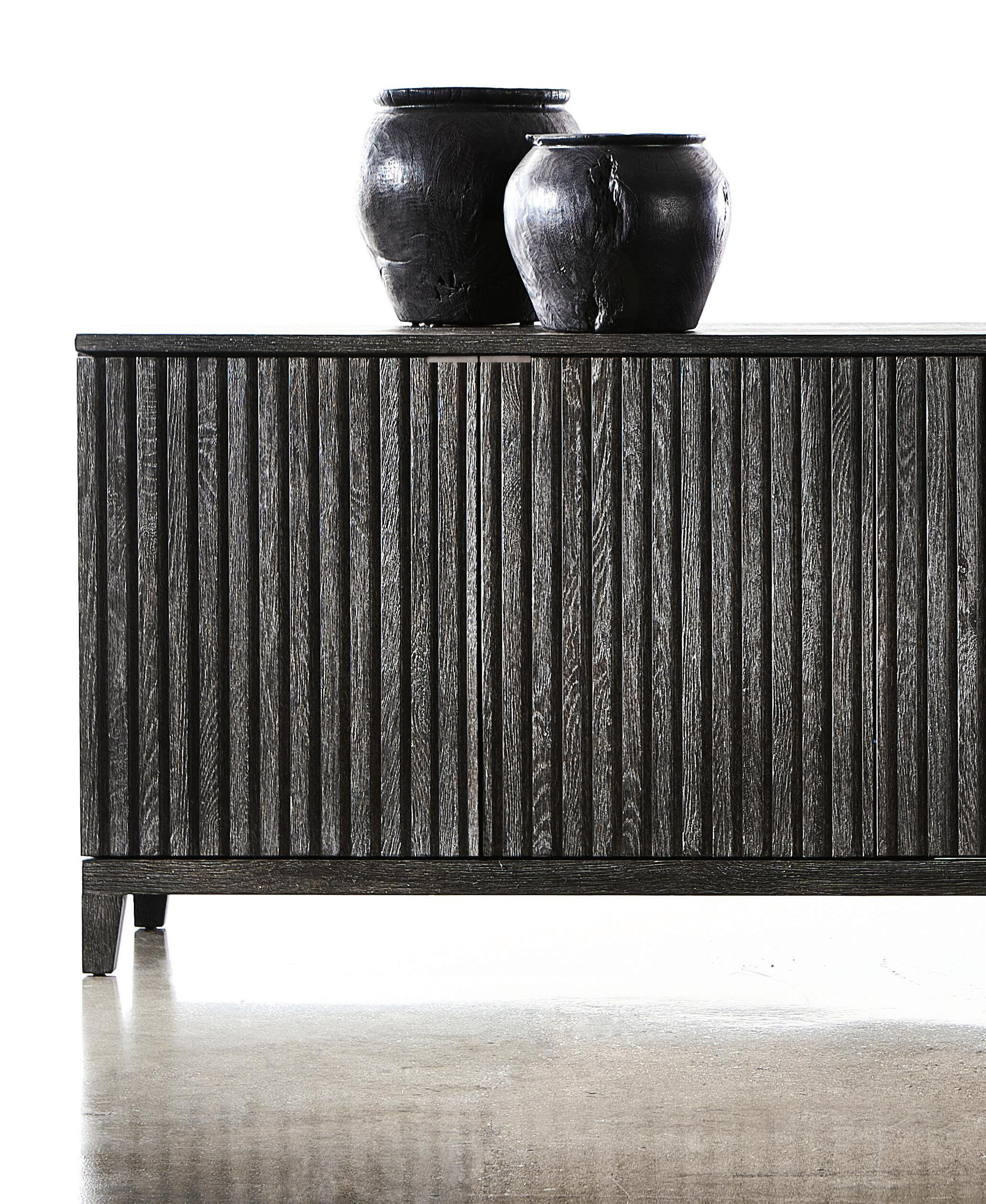 Materials/Finishes: Rustic oak case in Sutton finish with cast aluminum tab pulls in Dark Graphite finish. Six pull-to-open, soft-close drawers in the middle and right. Behind left door with ribbed design, is an open compartment with ventilation holes in back panel and bottom.