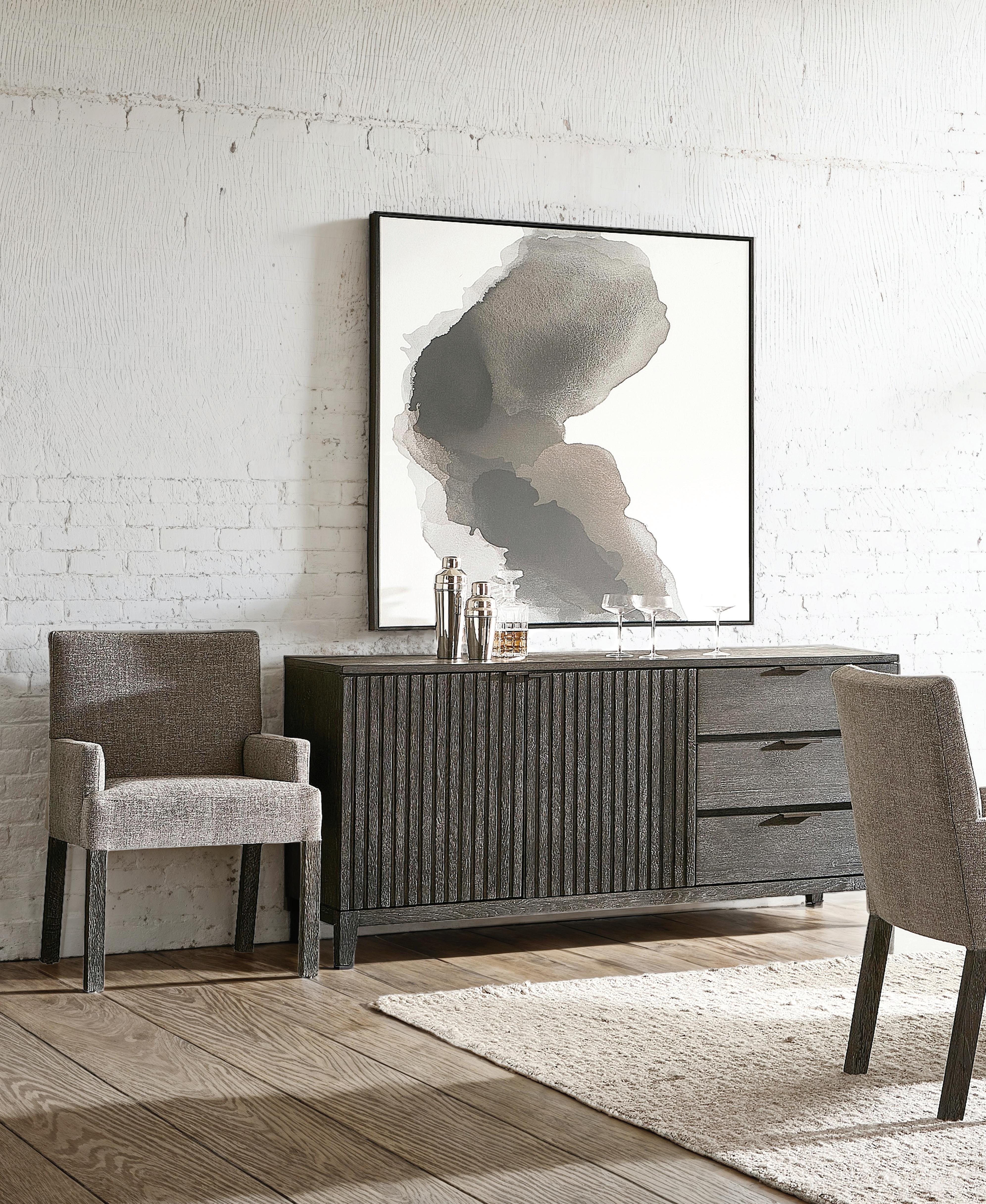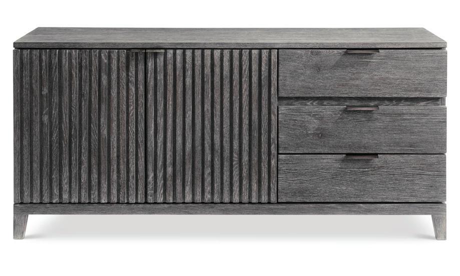 Materials/Finishes: Rustic oak case in Sutton finish with cast aluminum tab pulls in Dark Graphite finish. Three pull-to-open, soft-close drawers to the right. Behind left door with ribbed design, is an open compartment with ventilation holes in back panel and bottom.