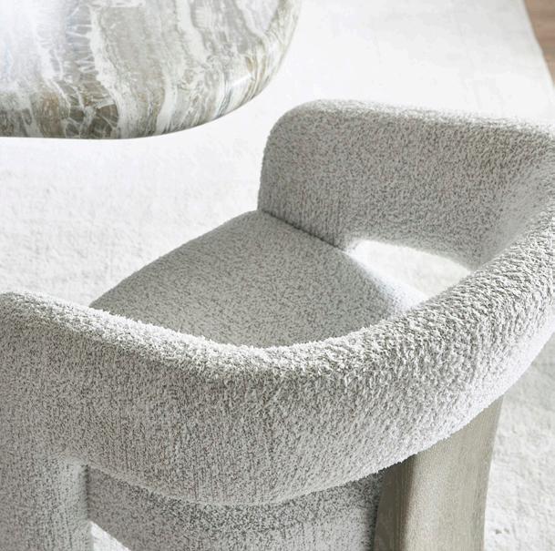 Collection textiles include textural and woven fabrics in neutral hues.
