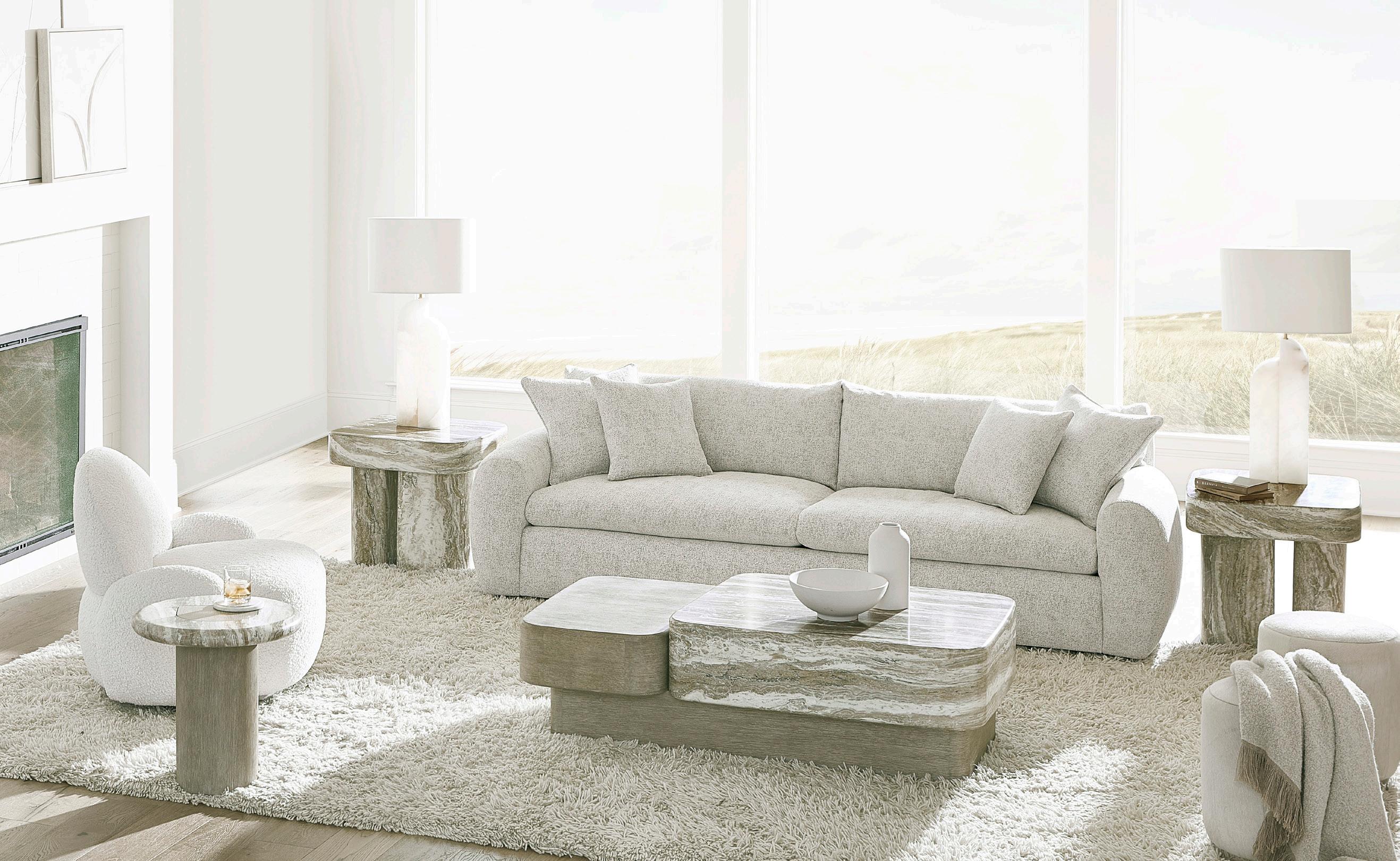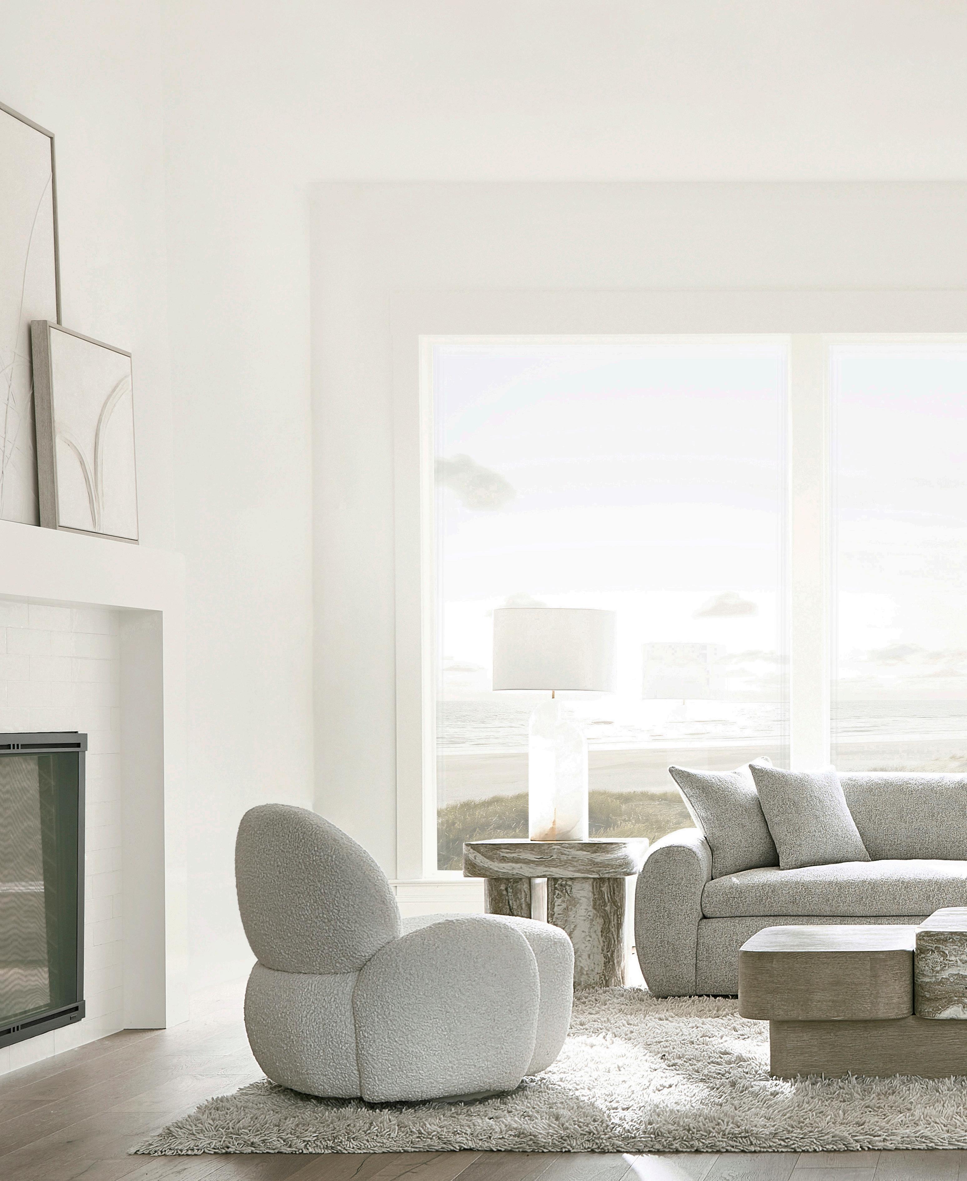 PAGES 10-11: 334022 Cocktail Table, 334123 Side Tables, N8202S St. Jean Swivel Chairs, N3607 Teddy Sofa, 334554 Arm Chairs (Fabric B132).
