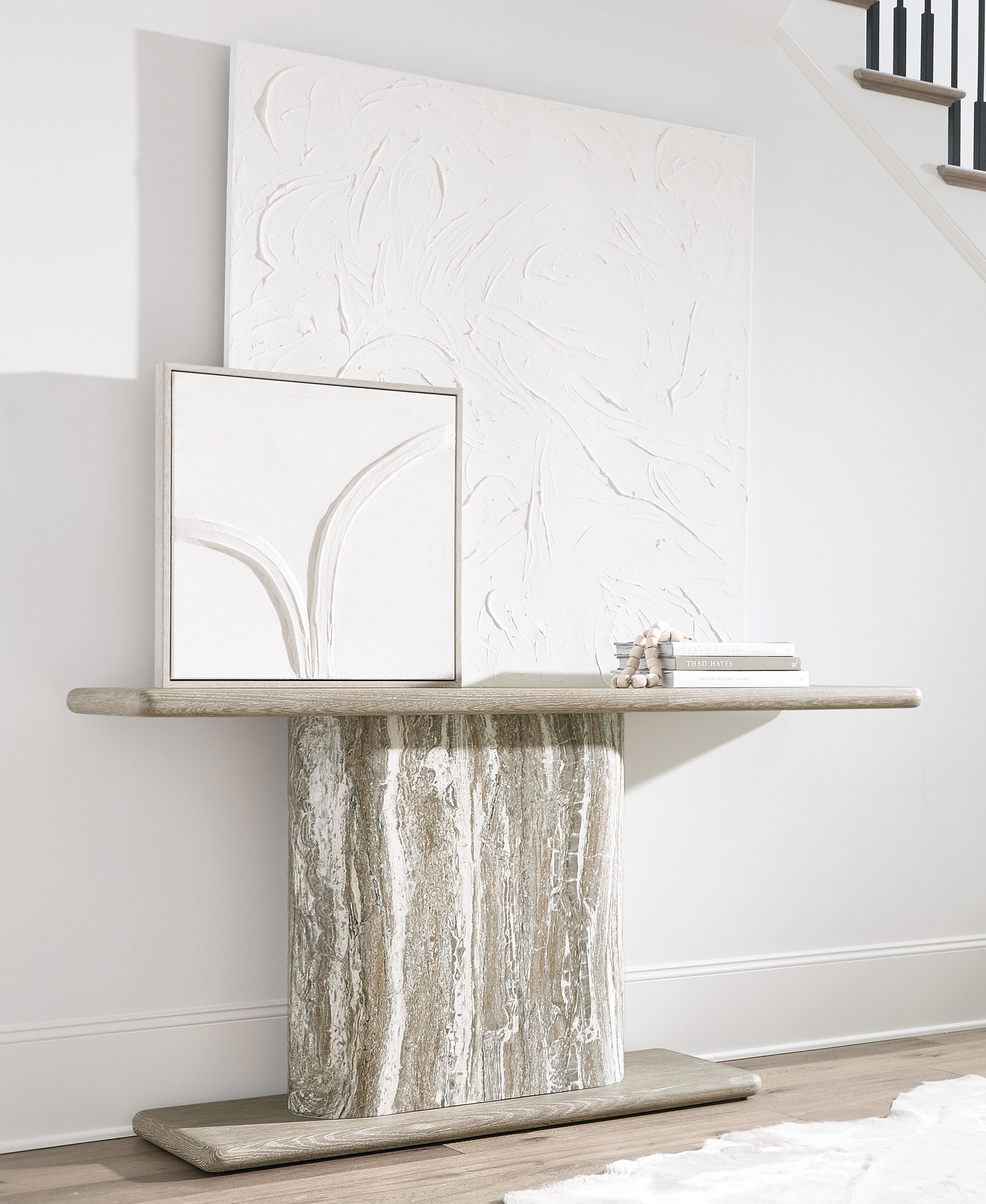 Rectangular wire-brushed, oak bullnose-edge top and shelf in Clay finish. Faux stone column in Kalta finish. Anti-tip kit. Adjustable glides. Note: Not designed to support TV and/or other media
