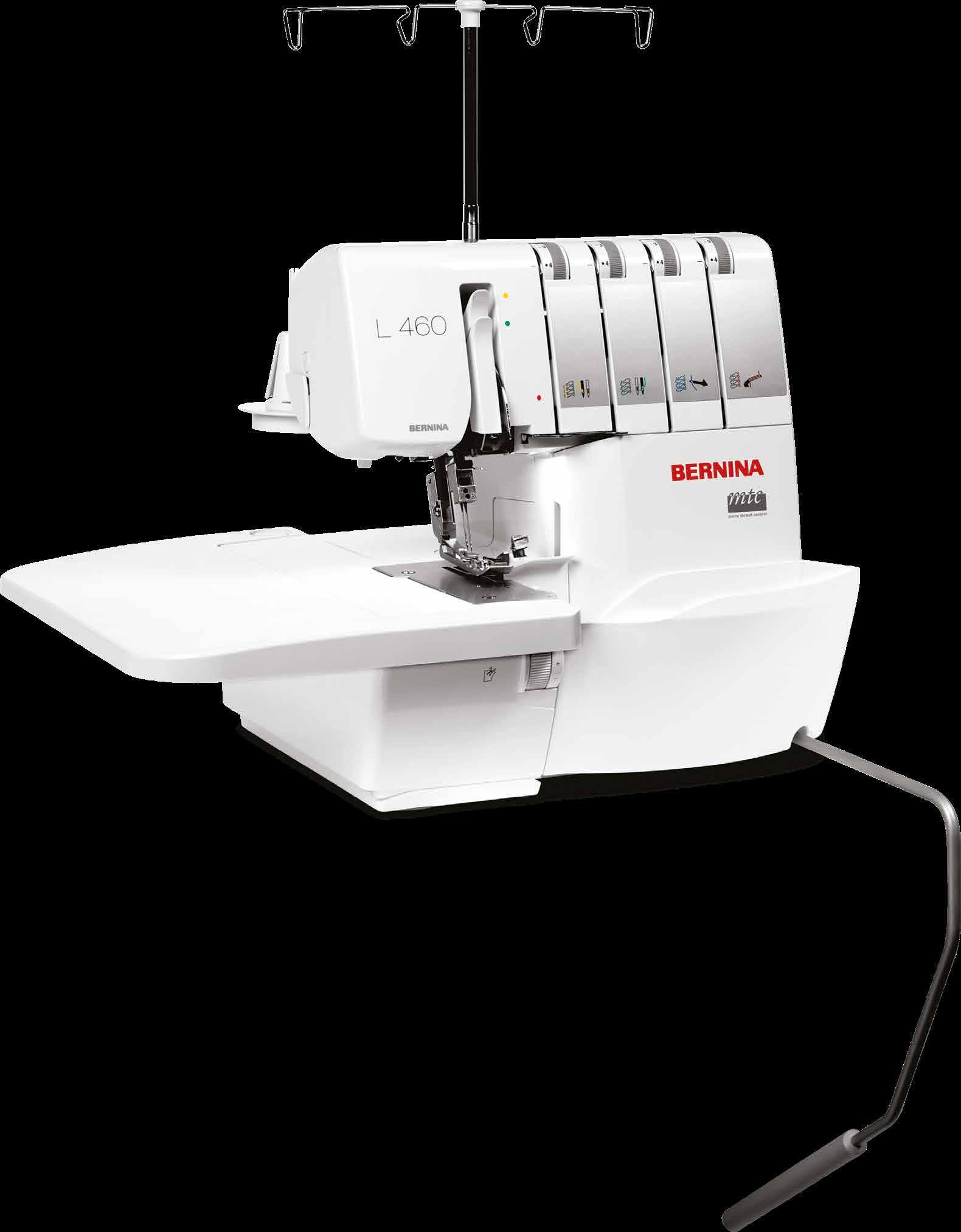 O grande espaço de trabalho bem iluminado bem como o enfiamento de linhas dos crochets e agulhas. A L 460 também inclui o sistema de mãos livres BERNINA (FHS) que baixa e temporariamente eleva o calcador, permitindo que ambas as mãos fiquem livres para costurar e colocar o tecido. A mesa extensível aumenta o espaço de trabalho para suportar projetos de costura maiores (padrão com a L 460, opção disponível para a L 450).