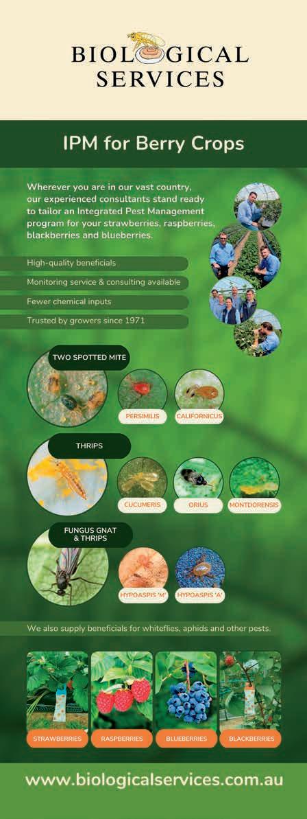 Whilst every care has been taken in the preparation of this journal, the information contained is necessarily of a general nature and should not be relied upon as a substitute for specific advice. The advice and opinions in the articles published in Australian Berry Journal are essentially those of contributors and do not necessarily reflect the views of Berries Australia or the Editor. The advice is at the reader’s own risk, and no responsibility is accepted for the accuracy of the material presented. Inclusion of an advertisement in this publication does not necessarily imply endorsement of the product, company or service by Berries Australia or the Editor. Horticulture Innovation Australia Limited (Hort Innovation) makes no representations and expressly disclaims all warranties (to the extent permitted by law) about the accuracy, completeness, or currency of information in Australian Berry Journal. Reliance on any information provided by Hort Innovation is entirely at your own risk. Hort Innovation is not responsible for, and will not be liable for, any loss, damage, claim, expense, cost (including legal costs) or other liability arising in any way, including from any Hort Innovation or other person’s negligence or otherwise from your use or non-use of Australian Berry Journal or from reliance on information contained in the material or that Hort Innovation provides to you by any other means. Copyright © Horticulture Innovation Australia Limited 2023 Copyright subsists in Australian Berry Journal. Horticulture Innovation Australia Limited (Hort Innovation) owns the copyright, other than as permitted under the Copyright ACT 1968 (Cth). Australian Berry Journal (in part or as a whole) cannot be reproduced, published, communicated or adapted without the prior written consent of Hort Innovation. Any request or enquiry to use the Australian Berry Journal should be addressed to: Communications Manager, Hort Innovation, Level 7 | 141 Walker Street, North Sydney 2060, Australia | E: communications@horticulture.com.au