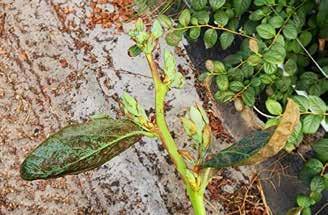Figure 2. Damage to blueberry flowers (top) and young flush (bottom) caused by swarm of adults Monolepta australis