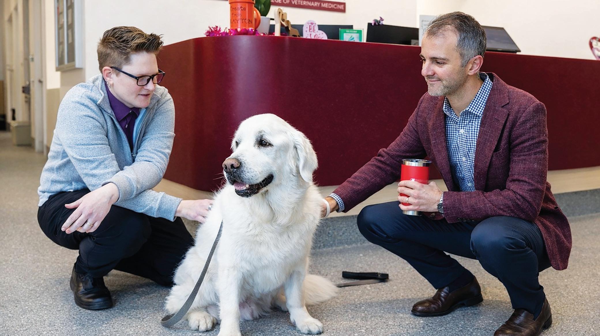 Virginia-Maryland College of Veterinary Medicine welcomed “Ragnar”—a local celebrity golden retriever and therapy dog of Oakey’s Funeral Service of Roanoke—to its Animal Cancer Care and Research Center at Virginia Tech Carilion Health Sciences and Technology Campus in Roanoke. Ragnar was diagnosed with an enlarged spleen and B-cell lymphoma. “Virginia Tech has raised him from the dead,” said Sam Oakey IV (pictured on right). “There were a couple of times when I didn’t know if he would last through the week before we started the treatments at the cancer center.” While Ragnar has improved dramatically, the road ahead is still a difficult one. Jonel Nightingale, DVM ’12 hospitalist (on left) said a reasonable expectation is 12-months of good quality life for Ragnar, dating from the start of cancer treatments in October.