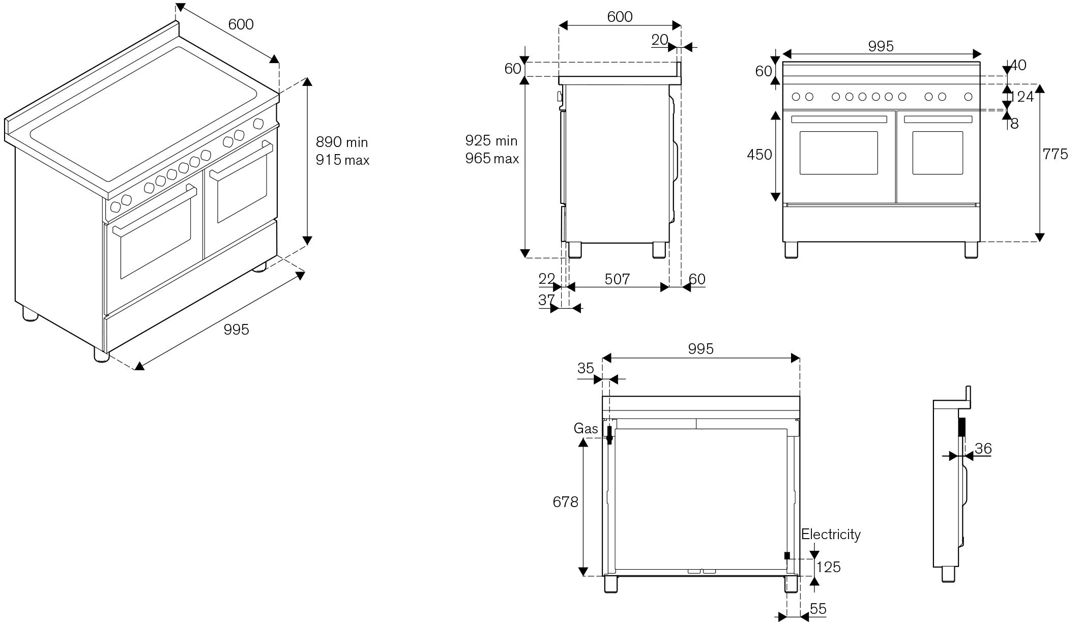 1000mm electric double oven (Decorative rail overhangs width 33mm each side, refer to image above. Flat-end caps available.)